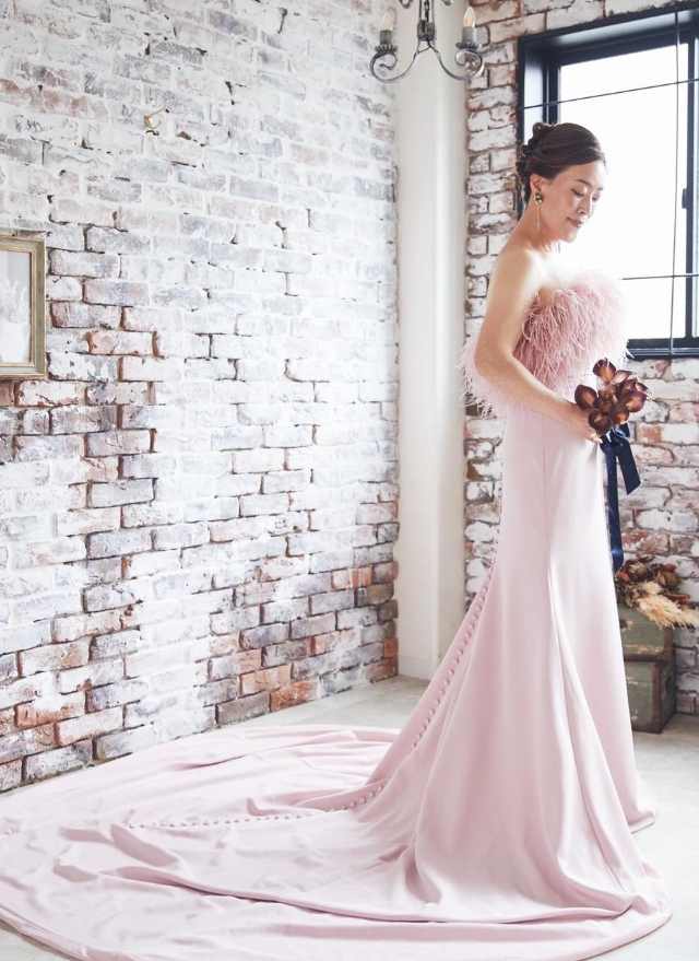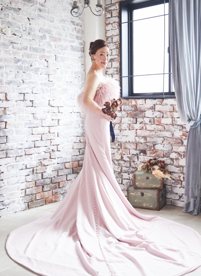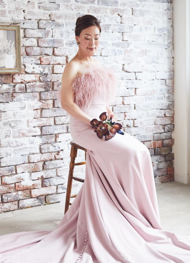 胸元がフェザーのピンクカラーのマーメイドドレス。