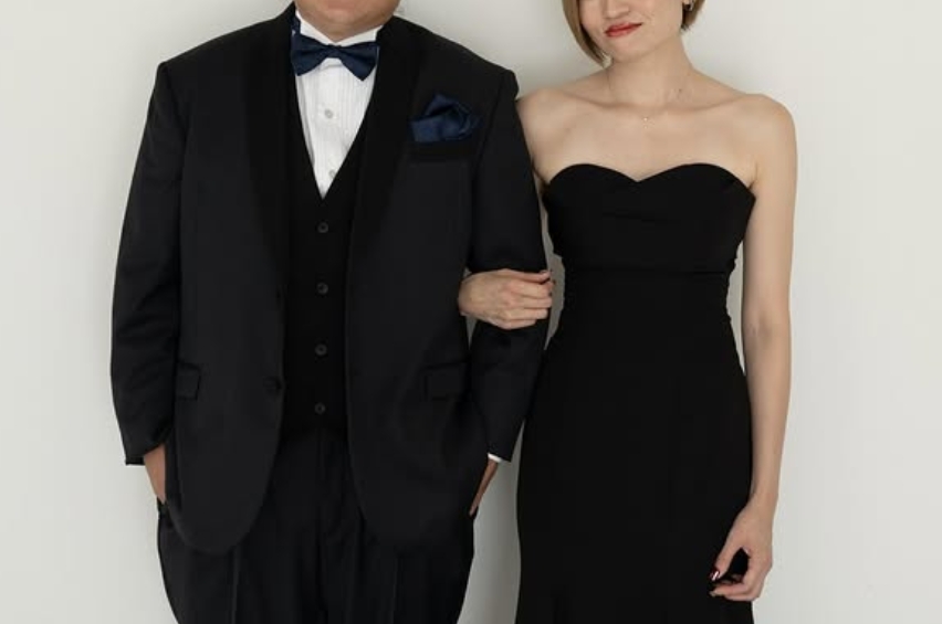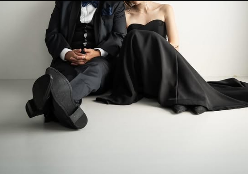 シンプルな背景に黒コーデで揃えたおしゃれなウェディングフォト