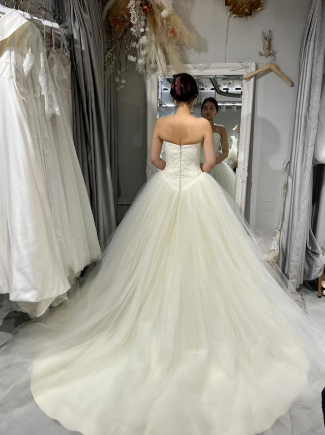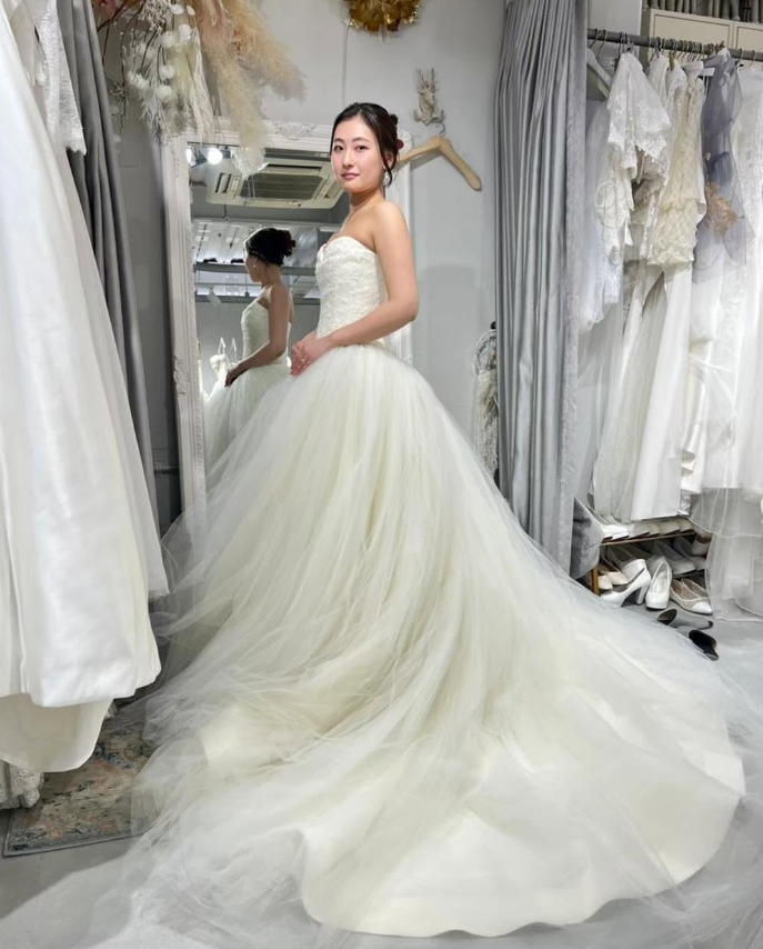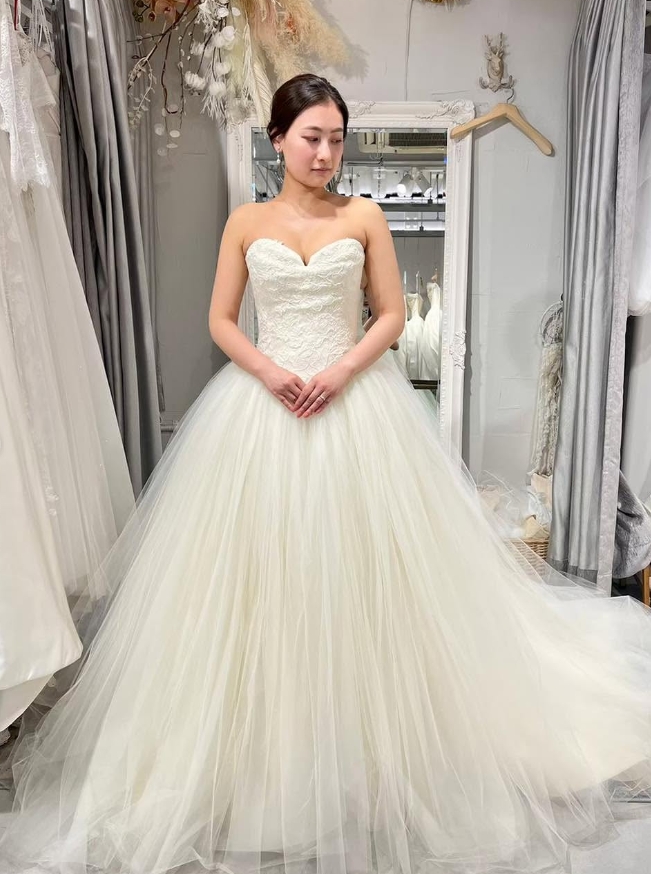 デコルテラインが引き立つベアトップと、ふんわり膨らむチュールスカートのコントラストが絶妙なドレスです♡