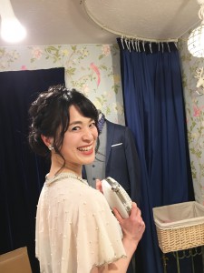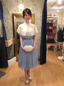 今回は神前式ということでしたので、少し丈の長いミモレ丈の5月にぴったりな 水色のベアドレスをセレクト!