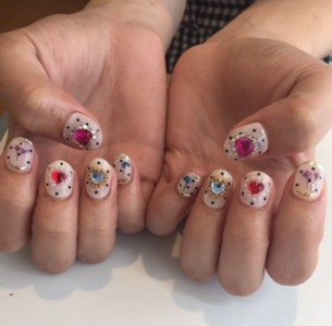 ドット柄にハートやパール、押し花を合わせて ポップでキュートなデザインに♡ こちらのお写真は付け放題 リピーター様5580円 ご新規様 5280円 のメニューです。