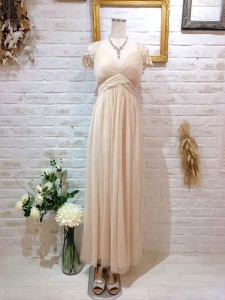 明るいピーチカラーのチュールロングドレス。