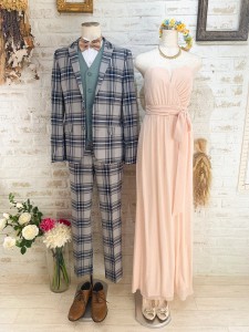 新郎様2次会向けジャケット、パンツ、ベストが入荷したのでその中から人気が出そうなチェック柄のコーディネートをご紹介します(^^)