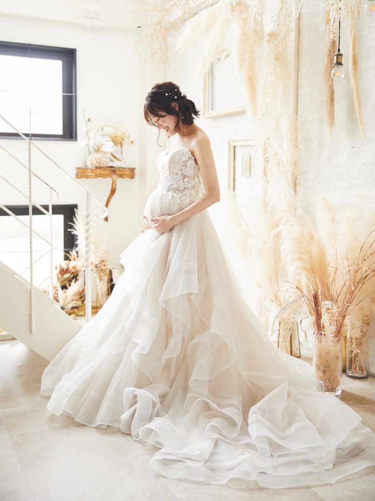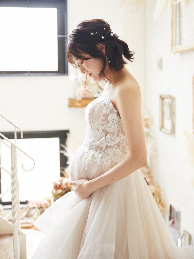 当店ではインポートドレスのサイズ展開を5号〜23号まで豊富に揃えておりますので、マタニティ用のドレスでなくても、可愛くてオシャレなドレスがマタニティの方でも着用していただけます。