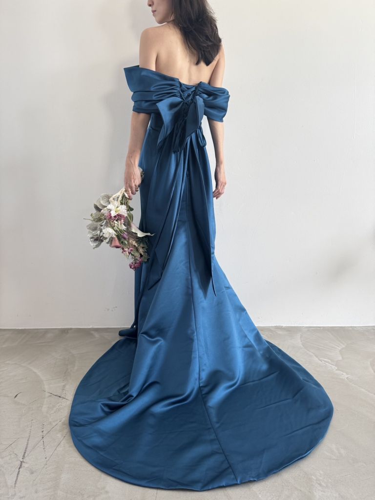 サテン素材の深めのブルーグリーンのカラーが印象的なマーメイドラインです。