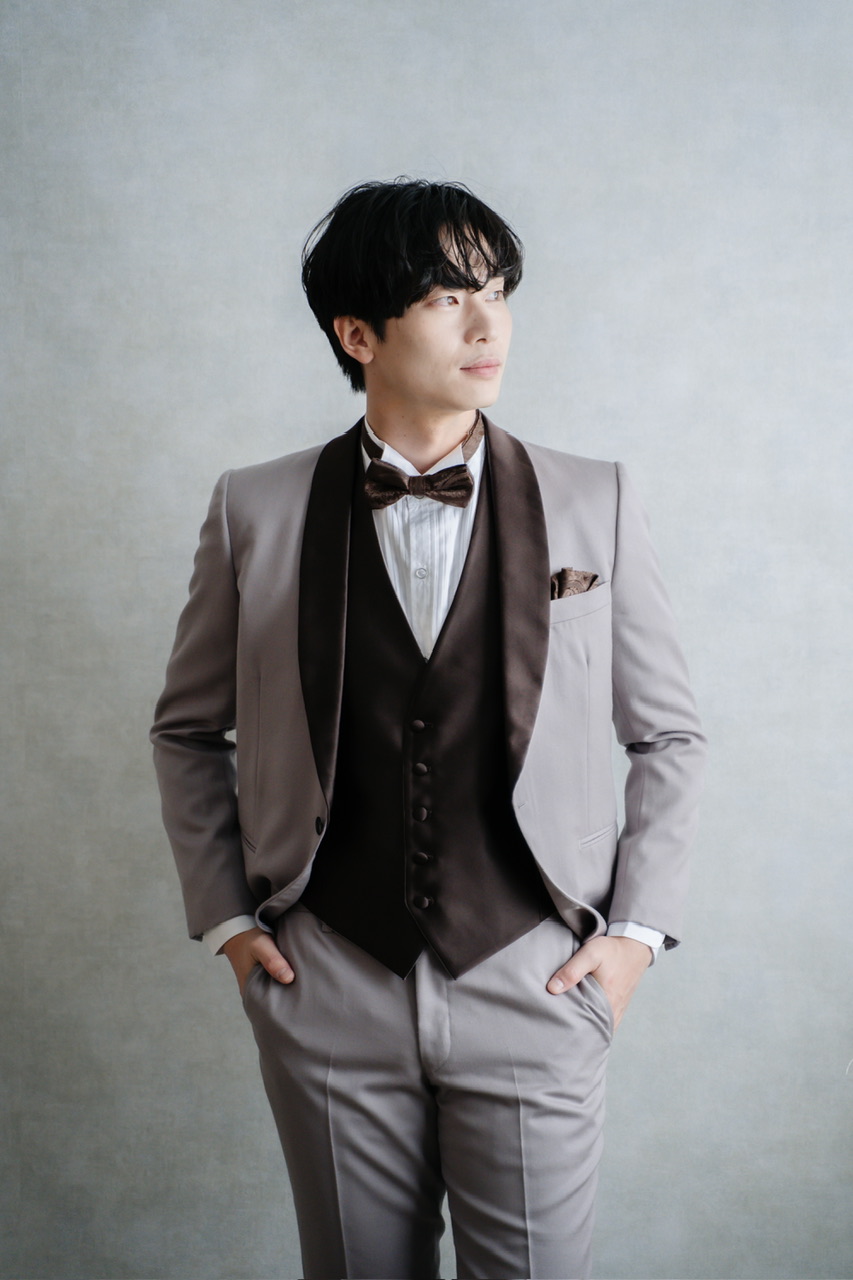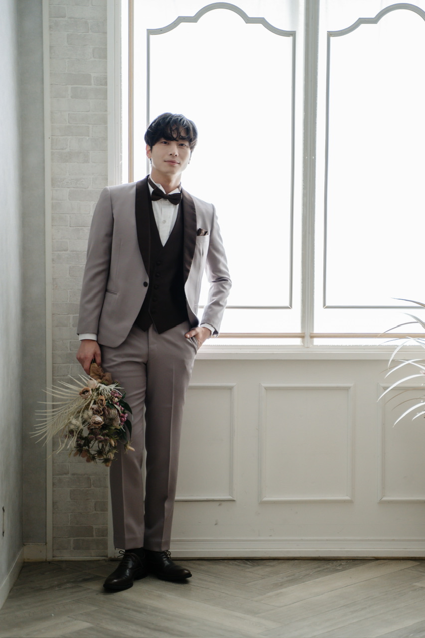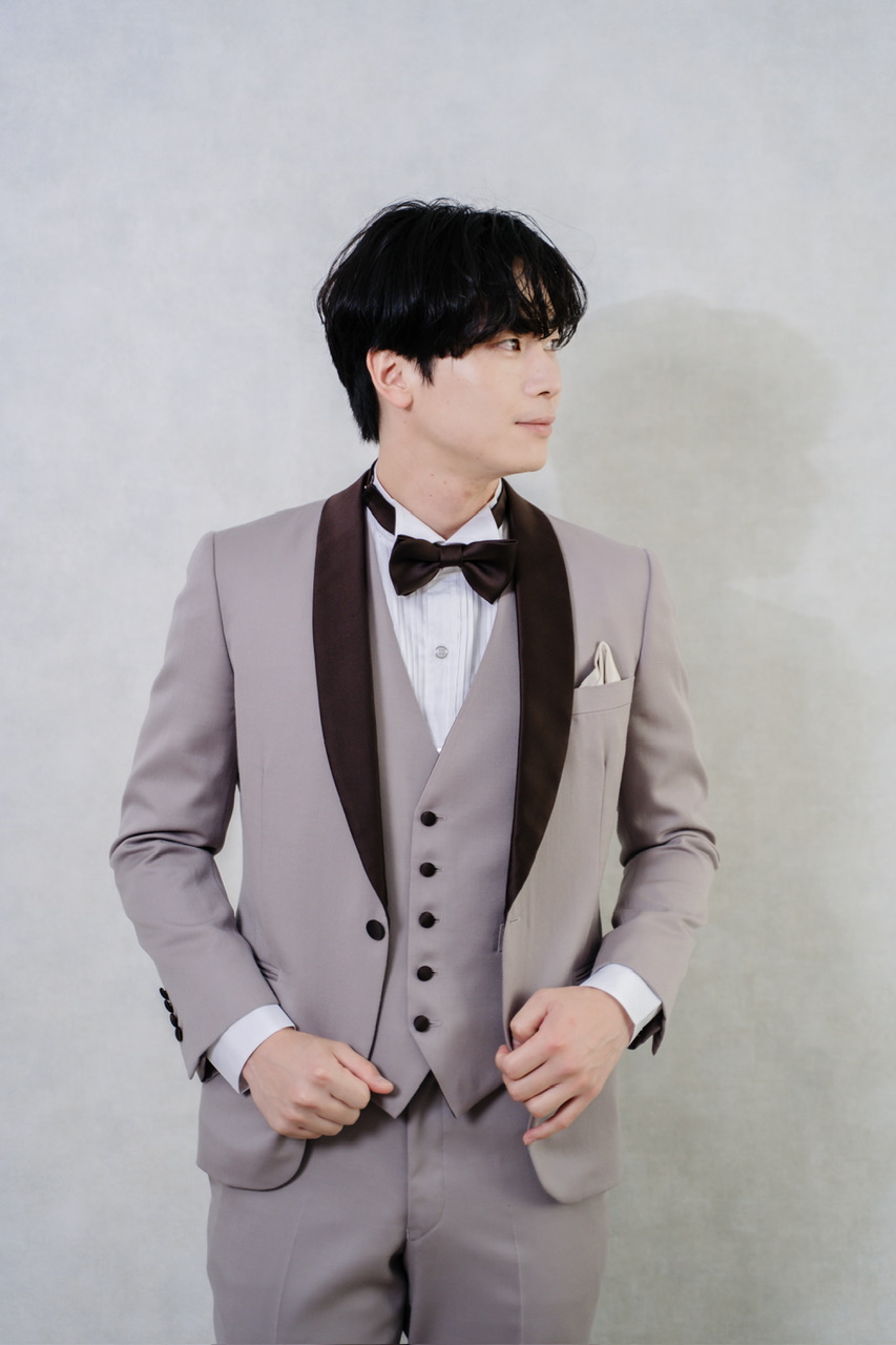柔らかなグレイッシュパープルのジャケットとパンツに、ブラウンのショールカラーと蝶ネクタイを組み合わせた上品なデザインです。落ち着きのある色味は大人の雰囲気を演出しながらも、写真映えする華やかさをプラス。挙式披露宴や二次会にも対応できるタキシード。定番のブラックやネイビーではなく、個性を出したい新郎におすすめのフォーマルセットアップです。