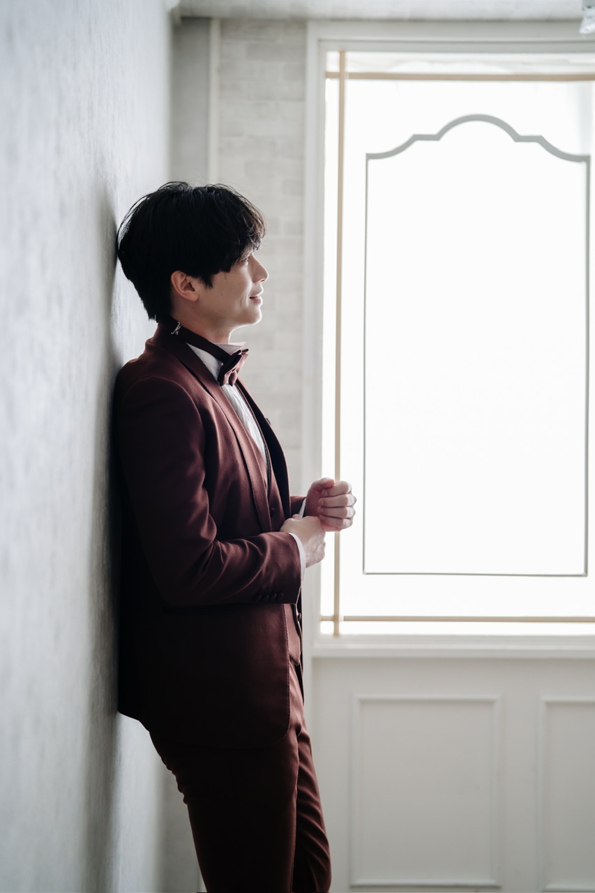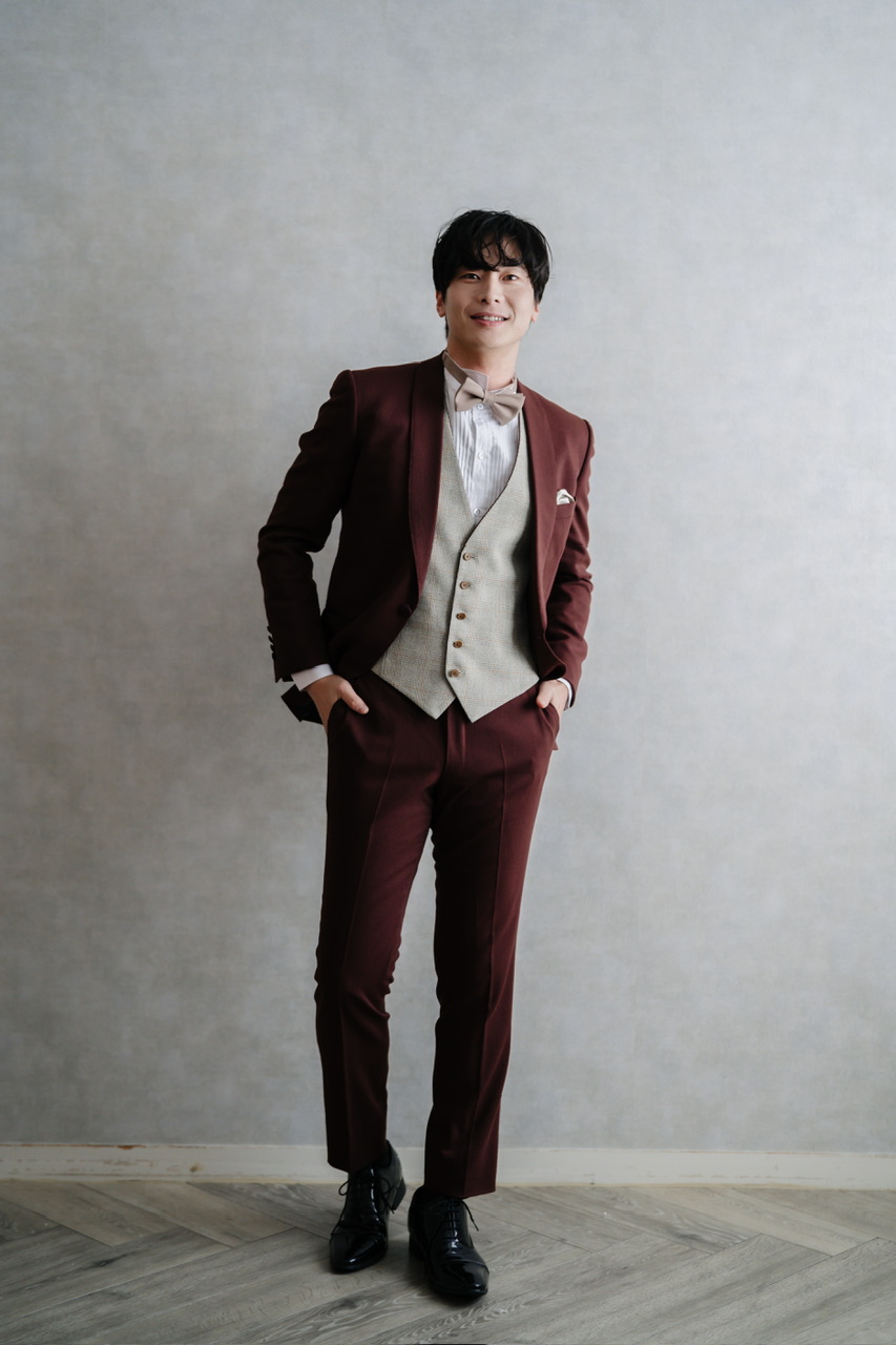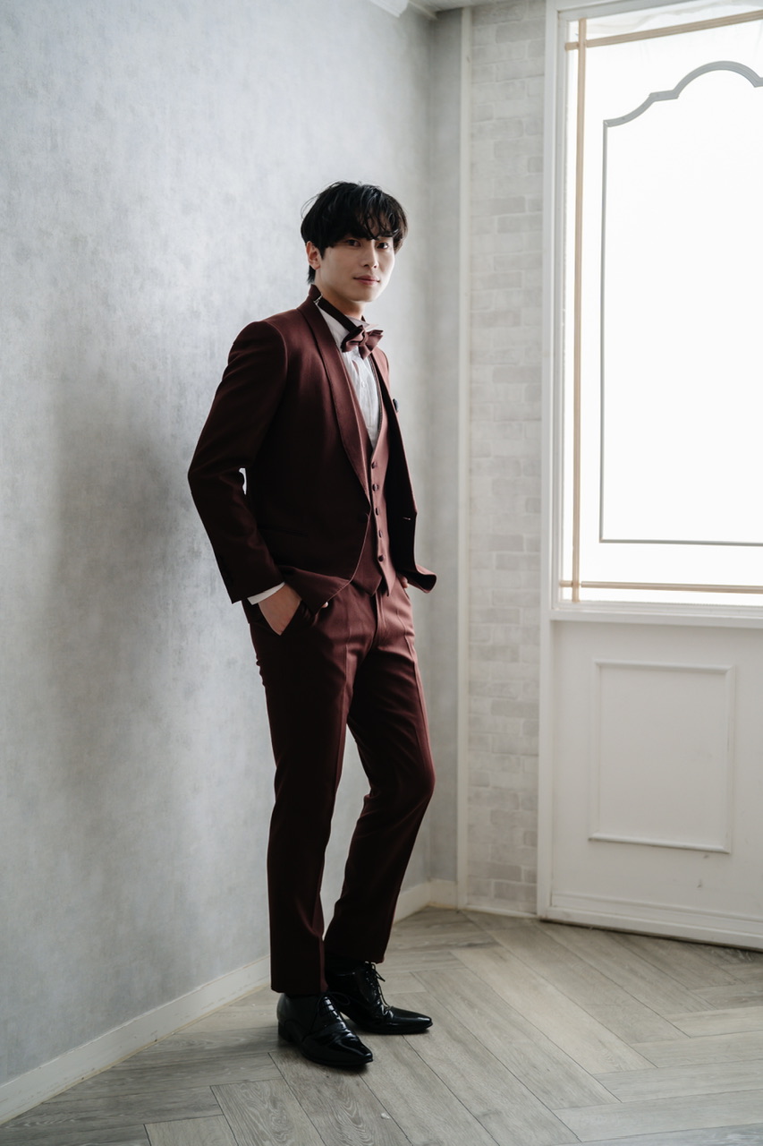 結婚式や前撮りにおすすめの新郎用ボルドータキシード。ジャケット・ベスト・パンツを揃えた3ピース仕様で、深みのある赤ワインカラーが華やかさと高級感を演出します。伝統的なタキシードのフォーマル感に加え、ボルドー特有の存在感が写真映えし、新郎の特別な一日をよりドラマチックに彩ります。披露宴や二次会にも対応可能で、クラシックさとモダンさを兼ね備えた特別なフォーマルスーツです。