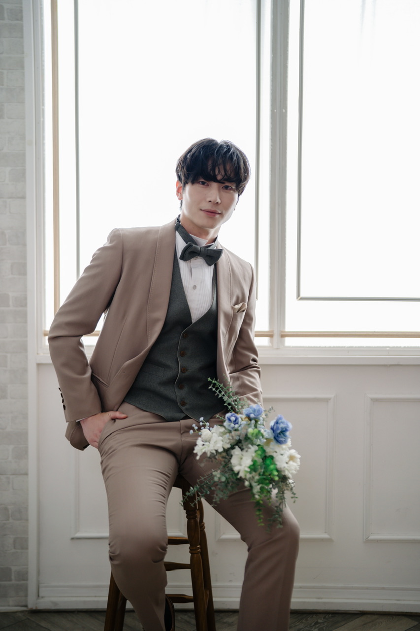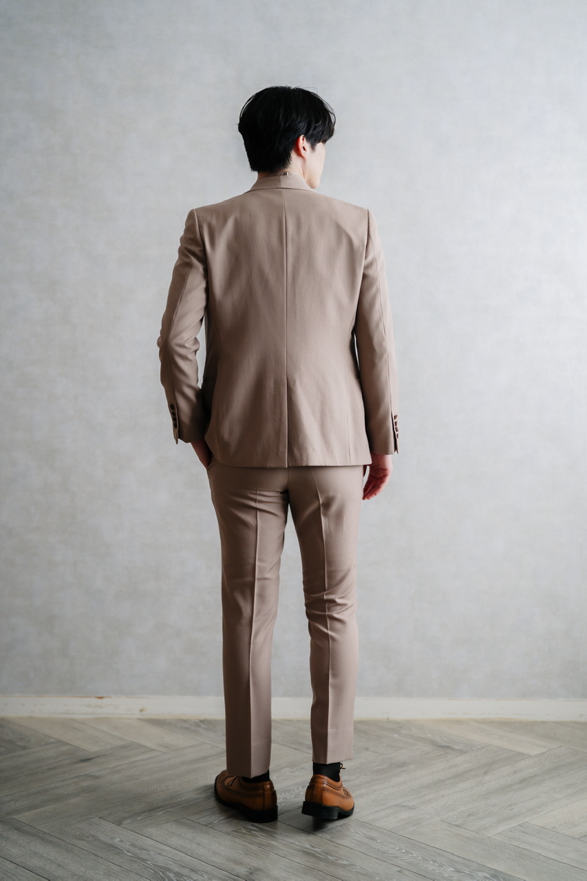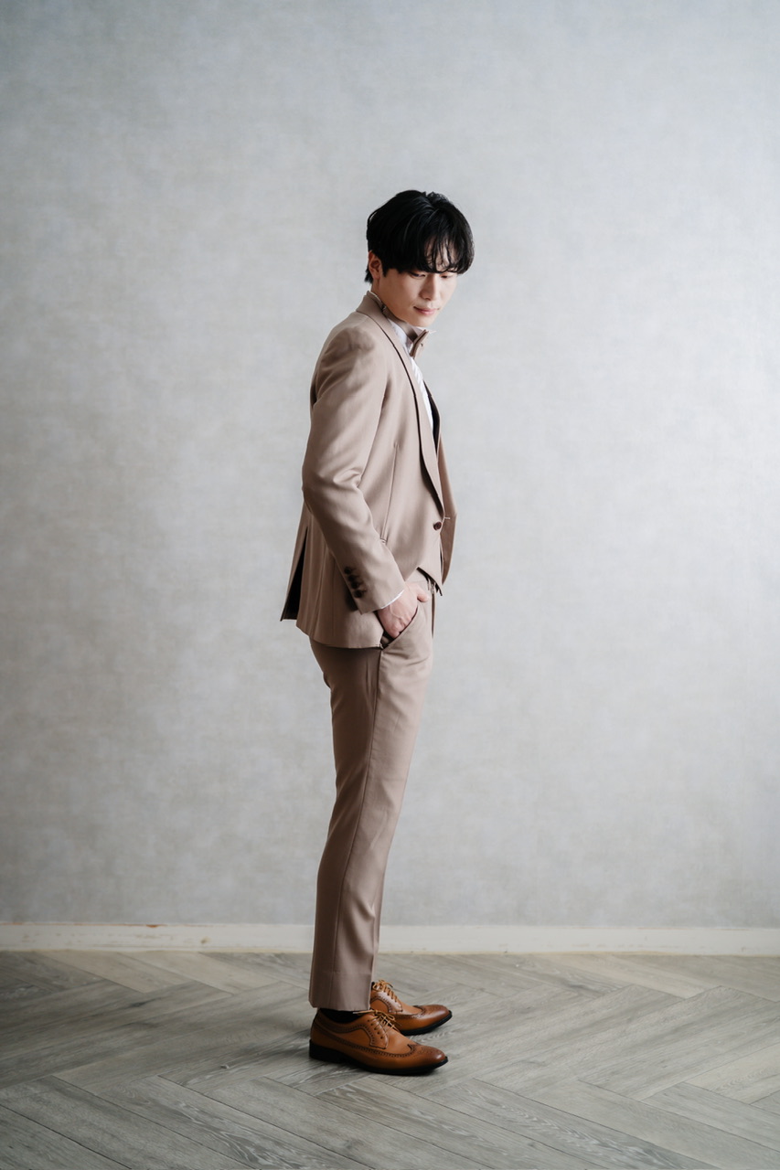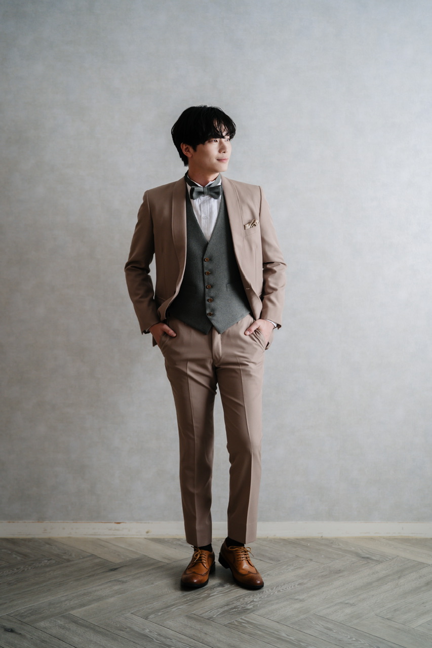 結婚式や前撮りにおすすめのライトブラウンスリーピースタキシード。優しい色合いが新郎をナチュラルで温かみのある印象に見せ、花嫁のドレスとも調和します。キャメルブラウンのボタンが可愛らしいアクセントとなり、ディテールにこだわりを感じさせます。さらに襟にはステッチが施され、シンプルながらも洗練されたデザインに。 写真のコーディネートはベストは濃いグリーンを合わせてガーデン風に。 披露宴や二次会にも対応できるフォーマルスーツで、特別な一日をスタイリッシュに演出する一着です。