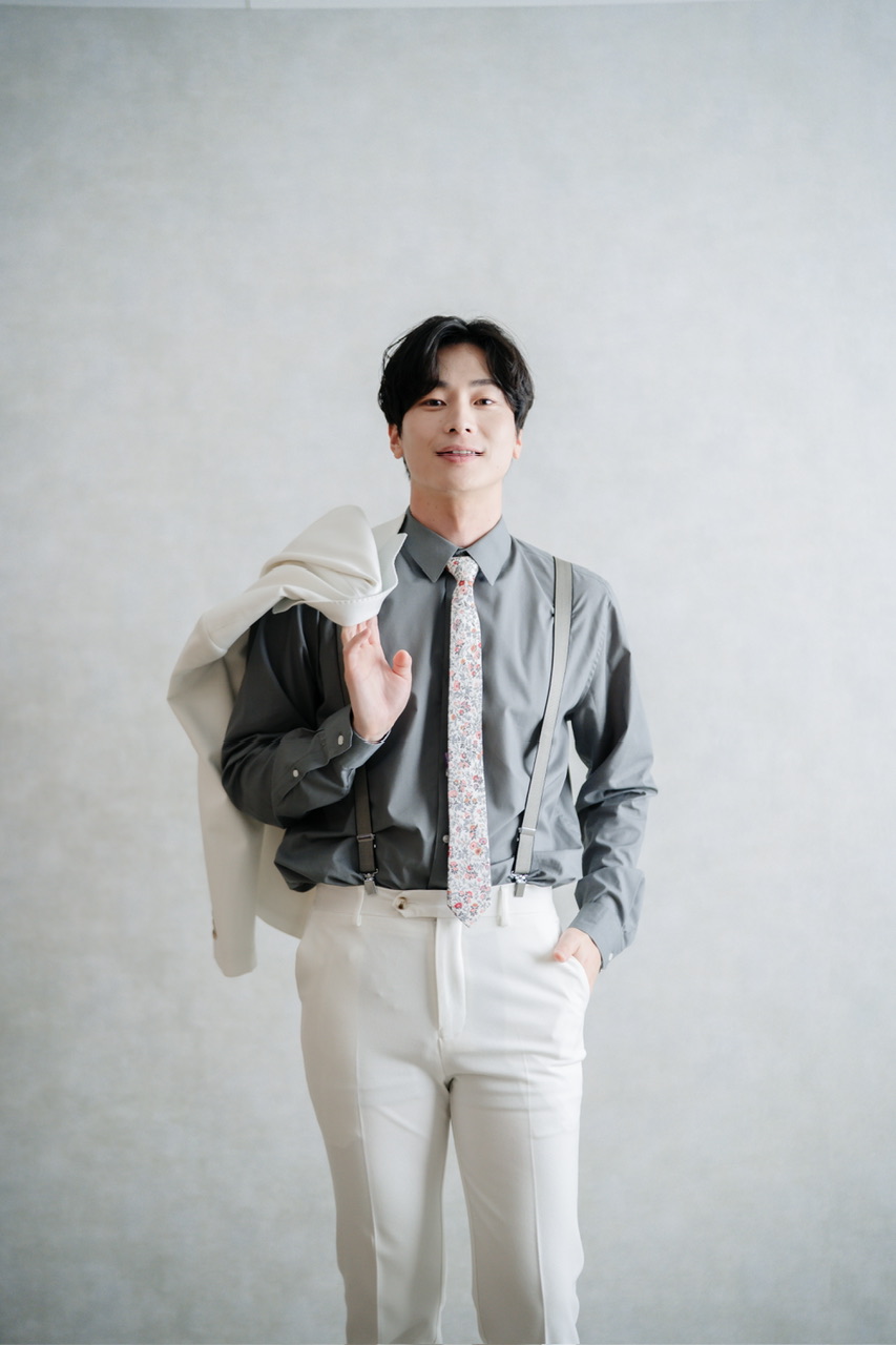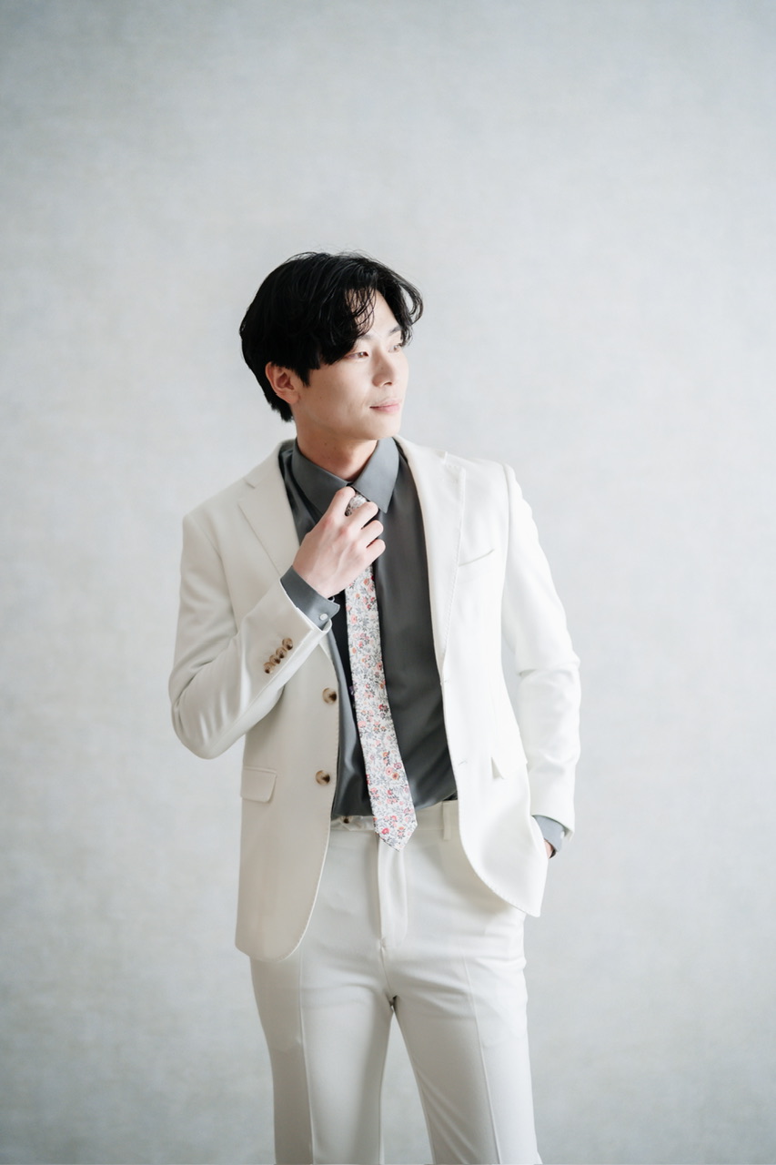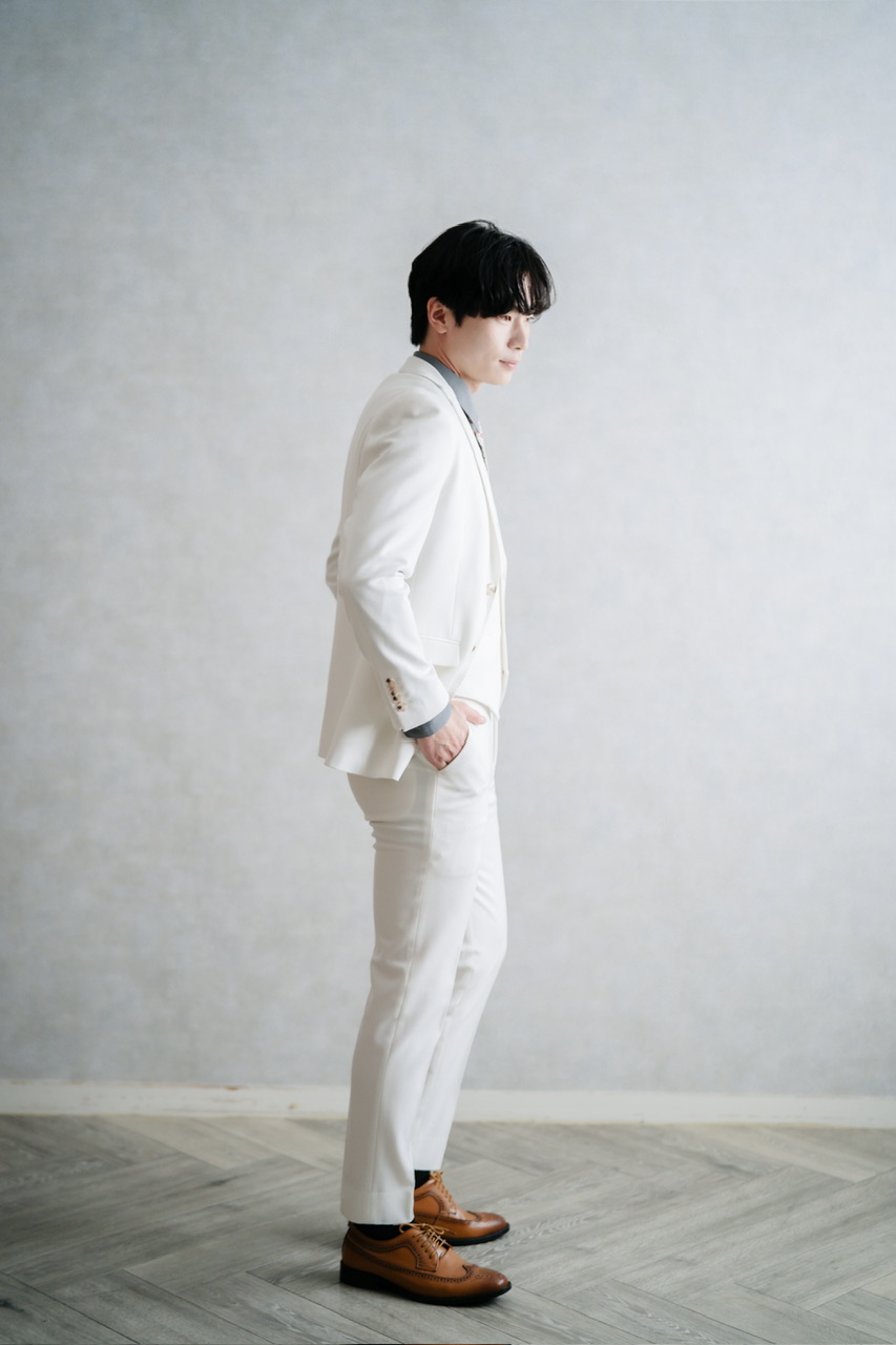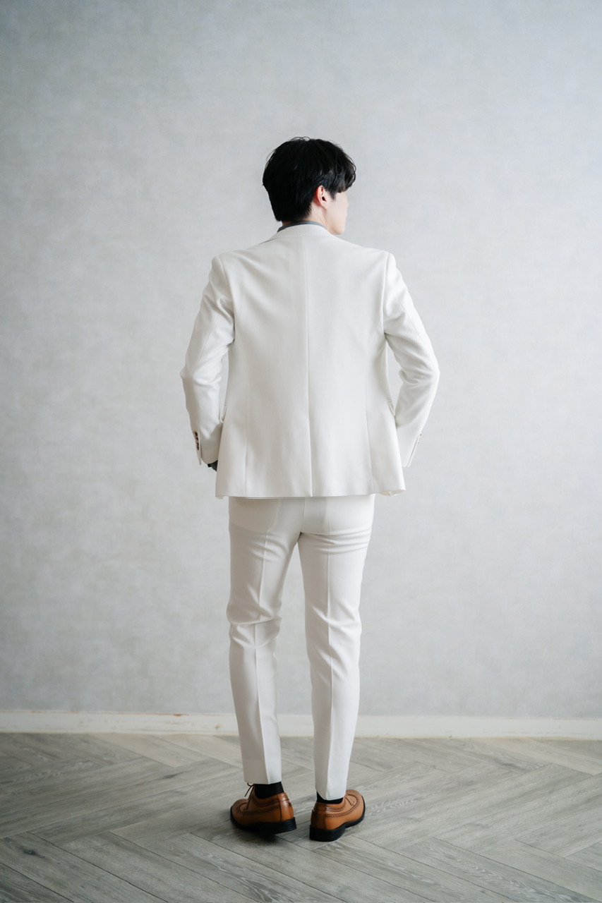 結婚式や前撮りに最適な新郎用WMICHAELオフホワイトタキシード。ジャケット・ベスト・パンツを揃えたスリーピース仕様で、ホワイトよりも柔らかいオフホワイトの色合いが、花嫁のドレスとも自然に調和します。洗練されたシルエットと上品なカラーが写真映えし、挙式から披露宴、二次会まで幅広いシーンに対応可能。クラシックでありながらも現代的な雰囲気を持ち、特別な日にふさわしいフォーマルスーツです。