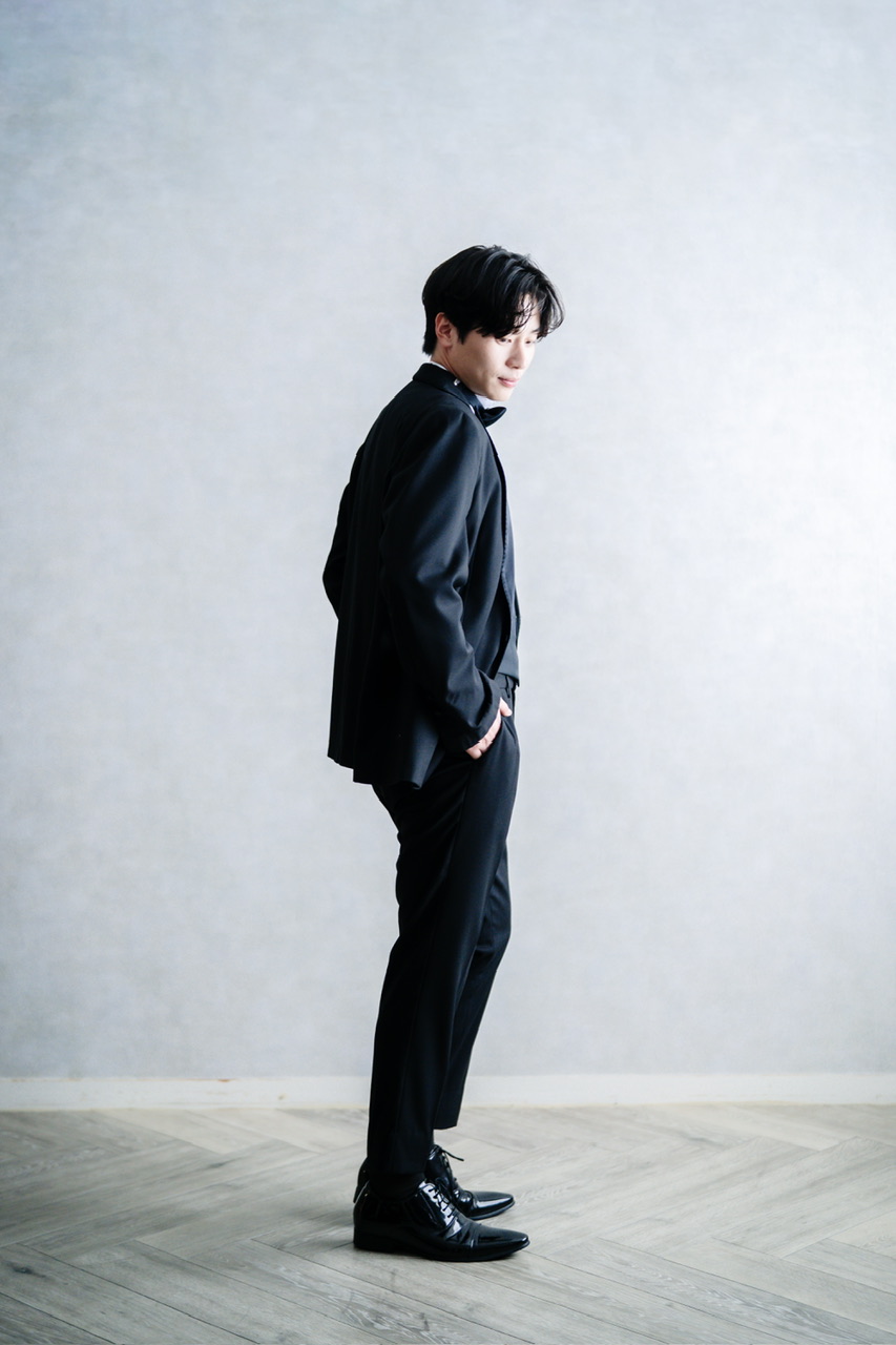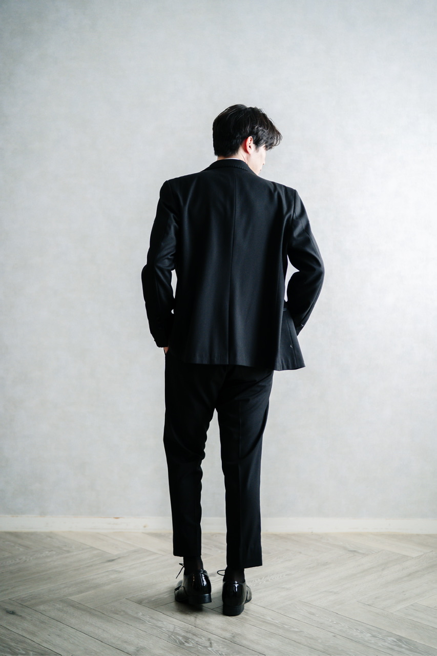 結婚式や前撮りにおすすめのイタリアブランド Mulish(ムリッシュ)のブラックタキシード。ピークトラペルのシャープな襟が胸元を引き立て、クラシックかつラグジュアリーな印象を与えます。ジャケットとパンツの2ピース仕様で、シンプルながらもイタリア仕立てならではの美しいシルエットが魅力。披露宴や二次会にも対応可能で、タキシード代わりとしても活躍します。写真映えする漆黒のフォーマルウェアは、新郎をよりエレガントに際立たせる特別な一着です。