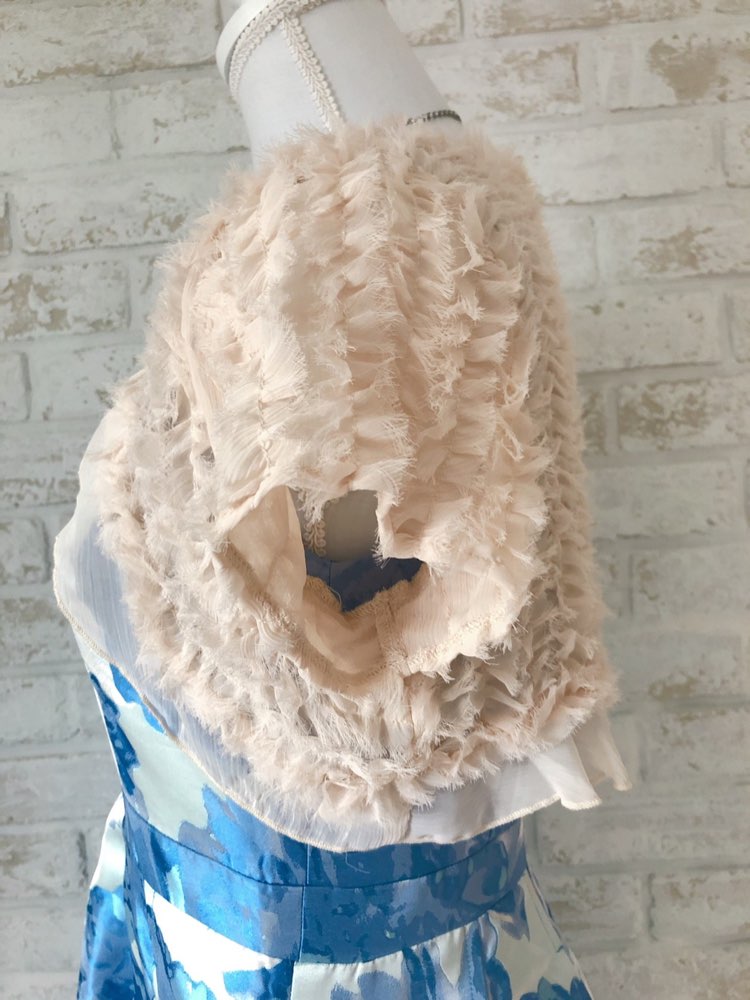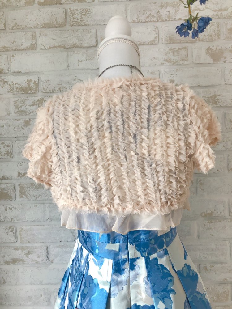 丈間は短めのファーボレロです!ファーなので、季節に合わせて秋冬シーズンでオススメしております!ファーもメインですが、首から胸元にかけてフリルが少しついているデザインになっているので、そこがまたポイントです!色味はホワイトなので、濃いめカラーのドレスと合わせても可愛いと思います。
