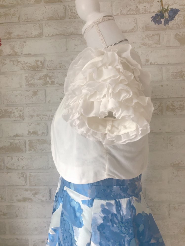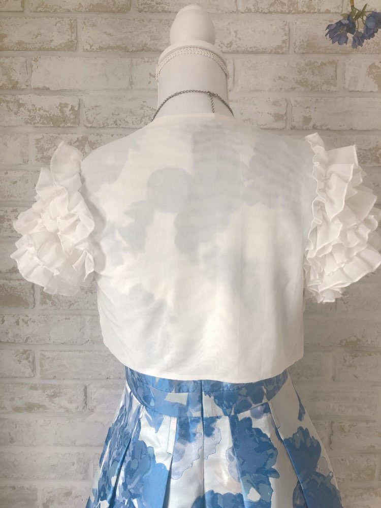 NGB-16のボレロと色違いで色味は、オフホワイトです!肩は同じく華やかでフリッとしているのがポイントで、とてもキュートです!オフホワイトなので、ドレスは濃い色をもってくるとかなり合うかと思います!
