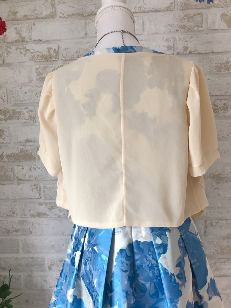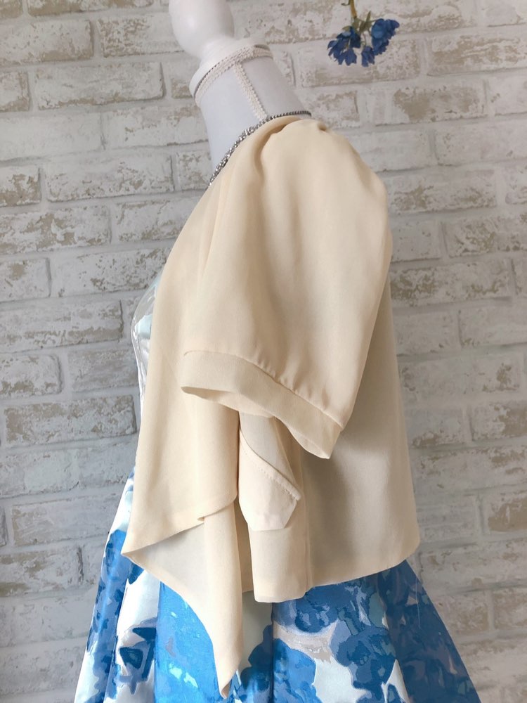 留め具がついているので前で留めることもできます!柔らかい素材の緩めボレロなので、カチッと着こなすよりかは緩めにぼかす感じで着ていただけますし、腕丈が半袖なので腕が気になる方は隠すこともできるボレロです!ベージュはオレンジ色に少し近いような強めのベージュです。どのドレスにも合わせやすい色味となっております!