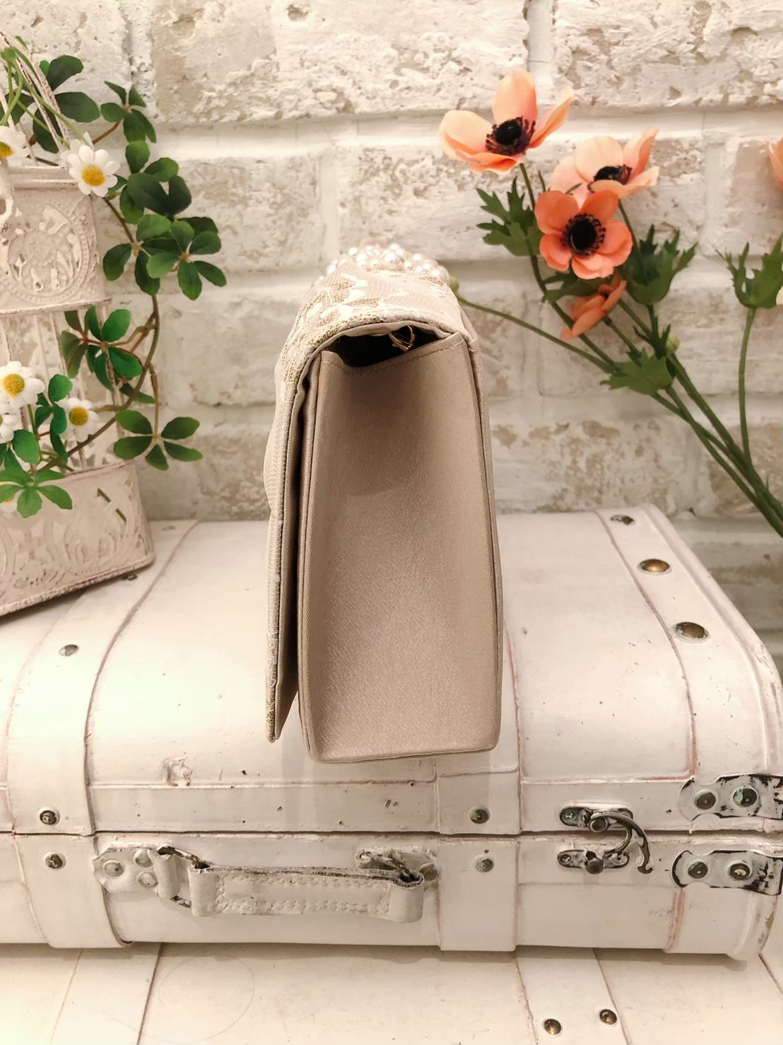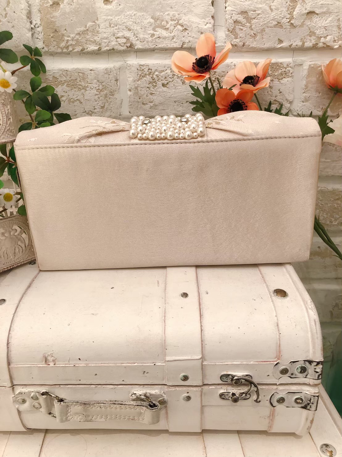 サテン生地のシャンパンゴールドカラーバッグです。ギャザーとビジュー、パールがハイセンスな雰囲気にしてくれる大人バッグです。 固めのしっかりとした形なので、格式高いお式でも使いやすいですよ! シンプルなデザインなので、多彩なフォーマルシーンで大活躍☆ チェーンは取り外し可能なので、クラッチだけでなく、ハンドバッグとしても使っていただけます。 ふんわりカラーのシャンパンゴールドのお色は、明るめカラーからダークカラーまで、どんなお色のドレスとも相性抜群!!