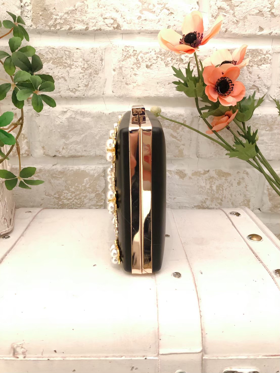 パールとビジューが表綿全体に可愛らしくデザインされた、ブラックベースのクラッチバッグです。革のような手触り、光沢感で高級感もあり、可愛らしさも兼ね備えた優秀クラッチバッグ。多彩なフォーマルシーンで大活躍☆ チェーンは取り外し可能なので、クラッチだけでなく、ハンドバッグとしても使っていただけます。 どんなお色のドレスとも相性抜群!! 普通に飽きたな・・とゆう方、他の人とは被りたくないな・・とゆう方、是非レンタルならではの楽しみ方で挑戦してみてください♪