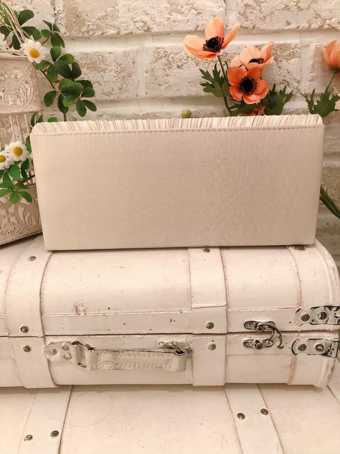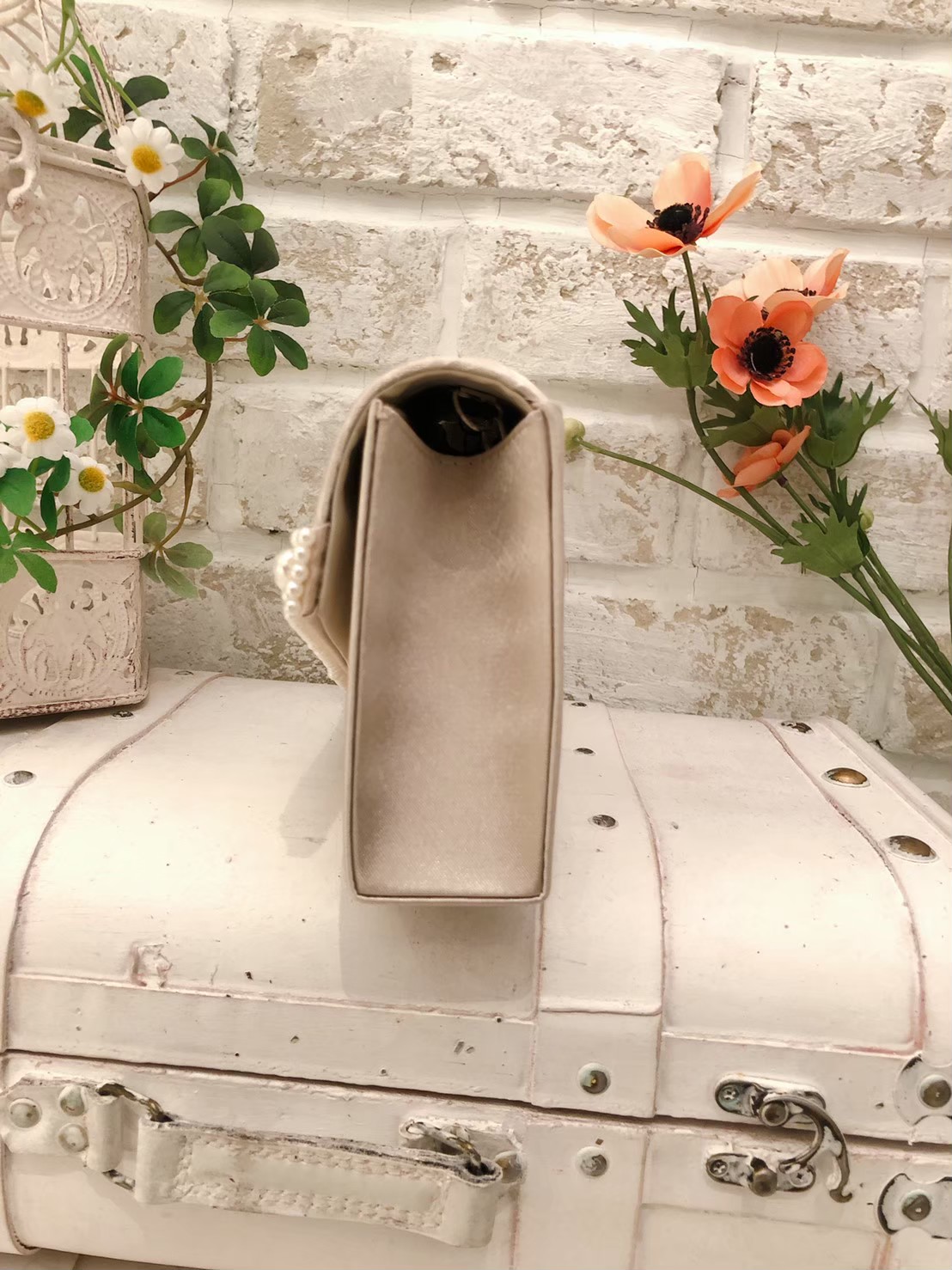 サテン生地のシャンパンゴールドカラーバッグです。ギャザーとパールがハイセンスな雰囲気にしてくれる大人バッグです。 固めのしっかりとした形なので、格式高いお式でも使いやすいですよ! シンプルなデザインなので、多彩なフォーマルシーンで大活躍☆ チェーンは取り外し可能なので、クラッチだけでなく、ハンドバッグとしても使っていただけます。 艶感のあるシャンパンゴールドのお色は、明るめカラーからダークカラーまで、どんなお色のドレスとも相性抜群!!