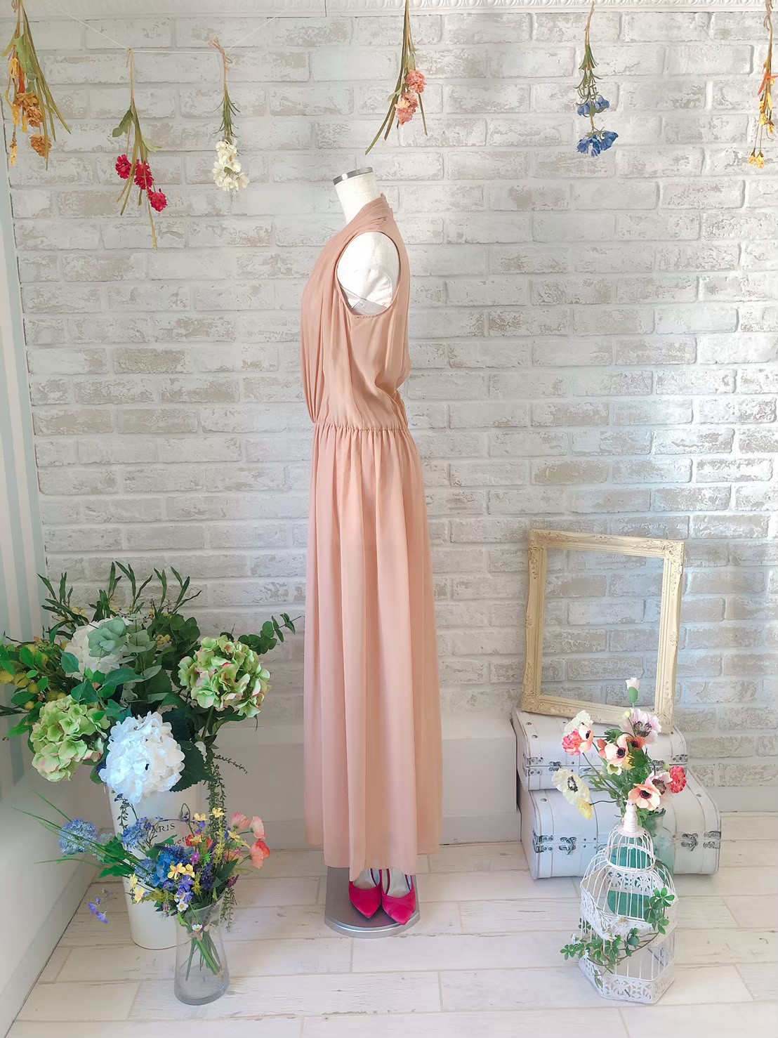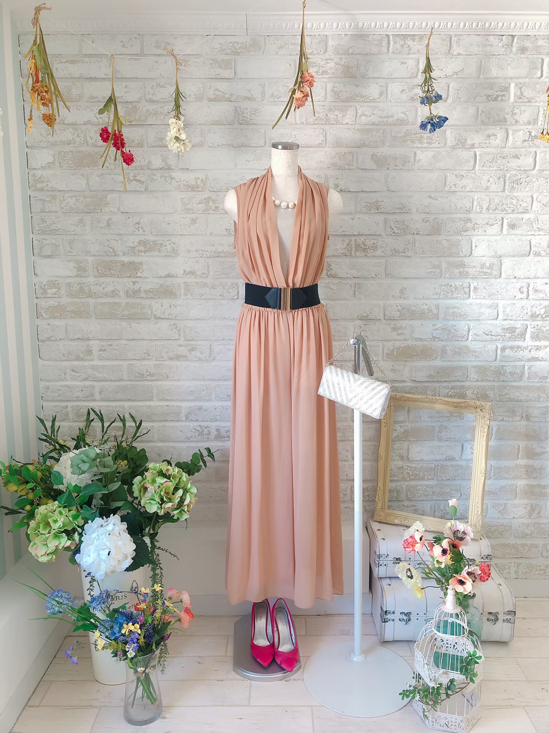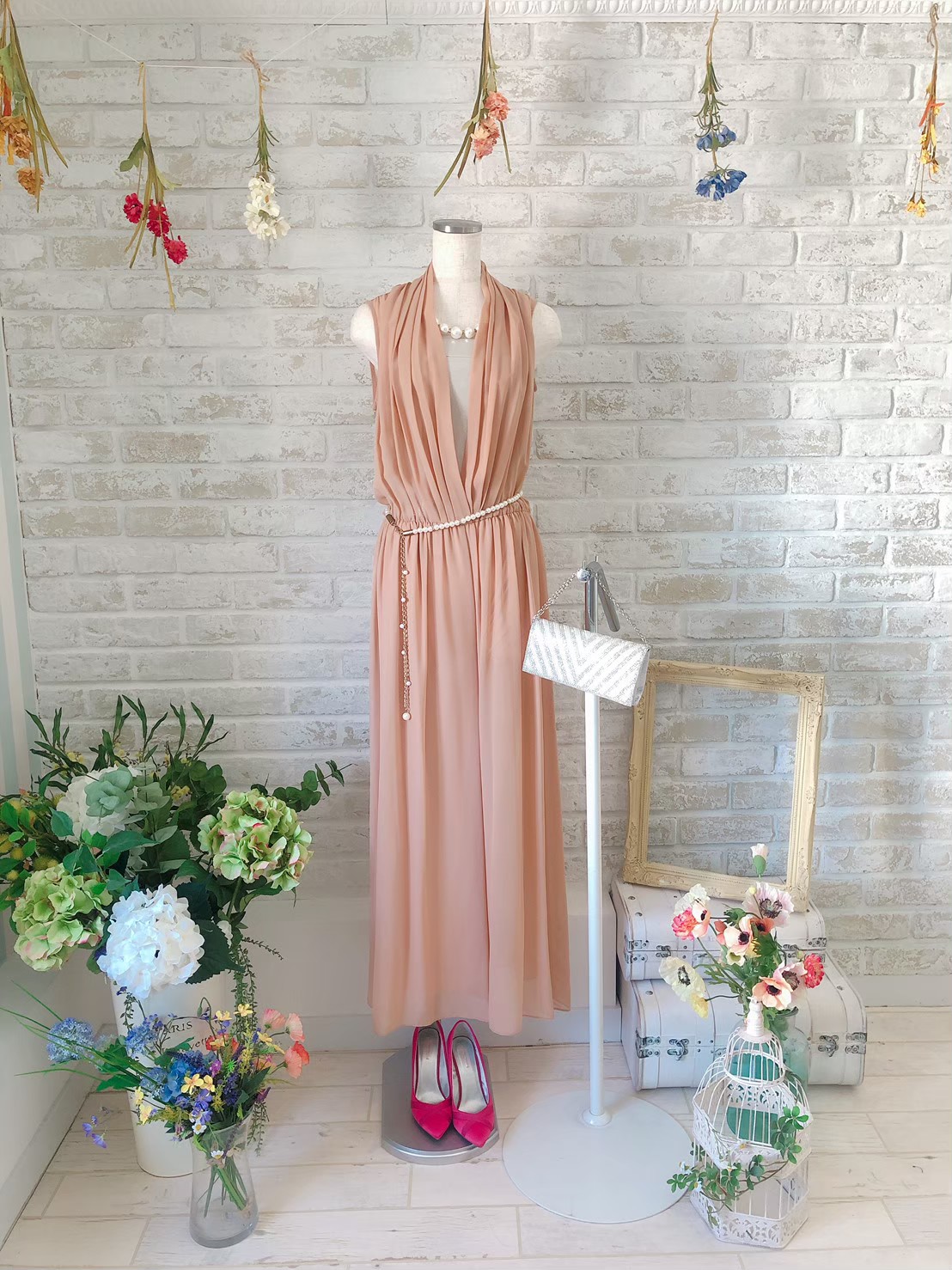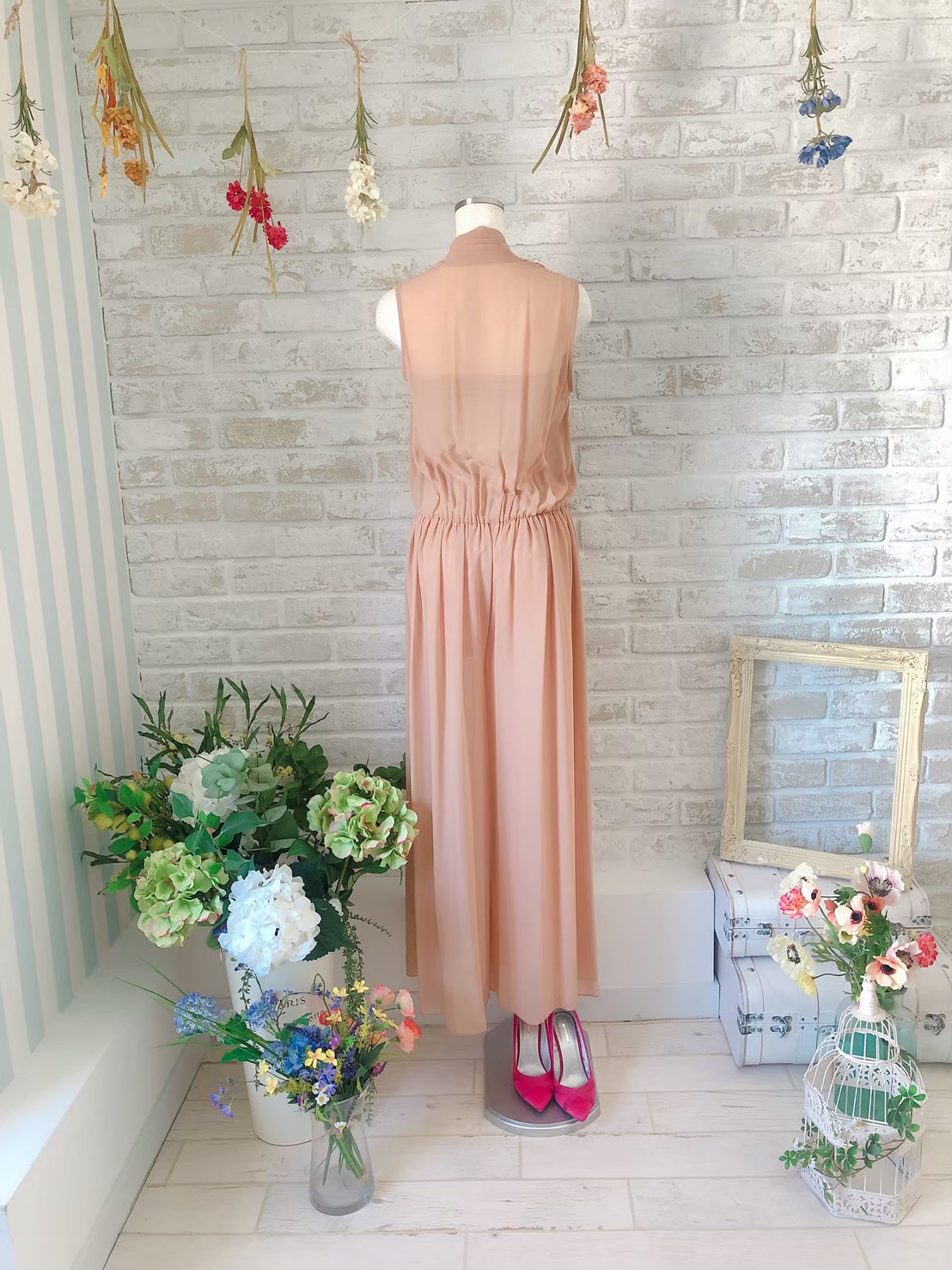 ピンクベージュのワイドパンツドレスです。シンプルなデザインでかつピンクベージュなので落ち着いたイメージで上品さを演出してくれます。 肩から腰にかけてのサイドフリルが女性らしく、大人女子にはオススメになっています。