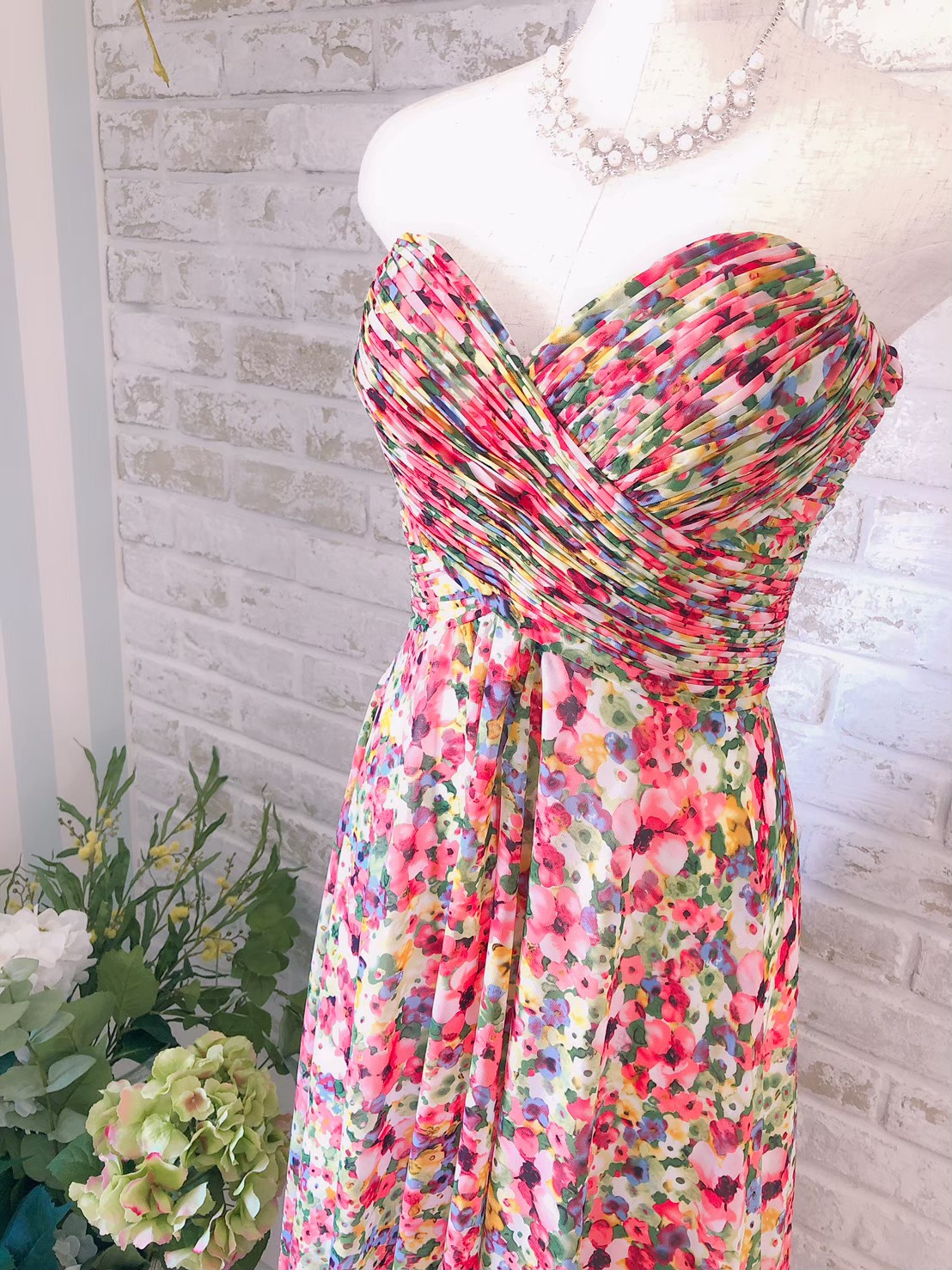 小花柄の可愛いアンクル丈のドレスです。こちらの商品はブライズ用となっていますが、羽織ものしたりアクセサリー1つでパーティー、謝恩会でもご利用いただけます。 ブライズの時は、お友達とお揃いコーデを楽しんで頂けます。 羽織ものをデニムジャケットにしても、リゾートなどではオススメです。ブライズだけの特権です◎。 ハートカットの胸元も女性らしさを演出してくれます。