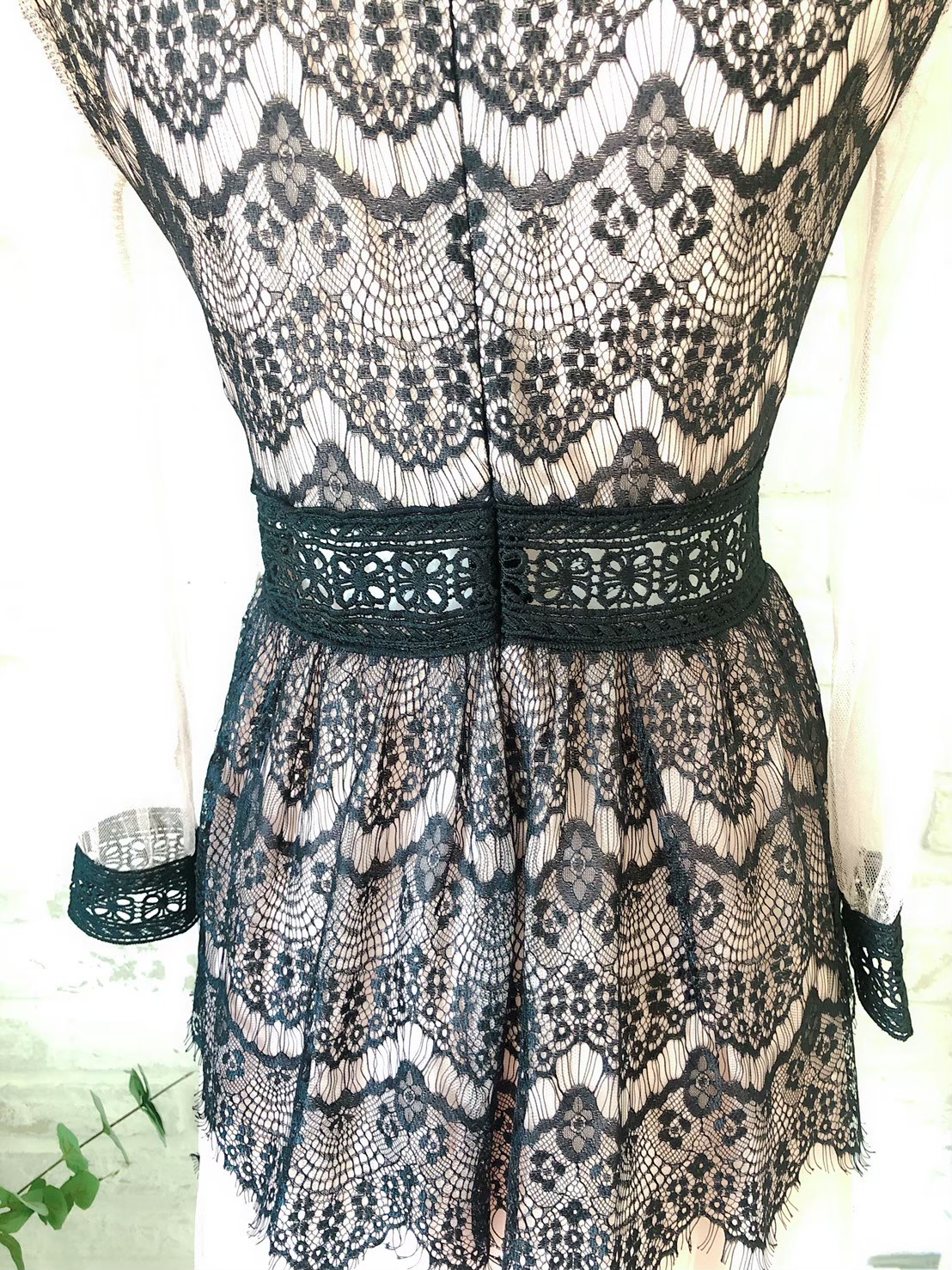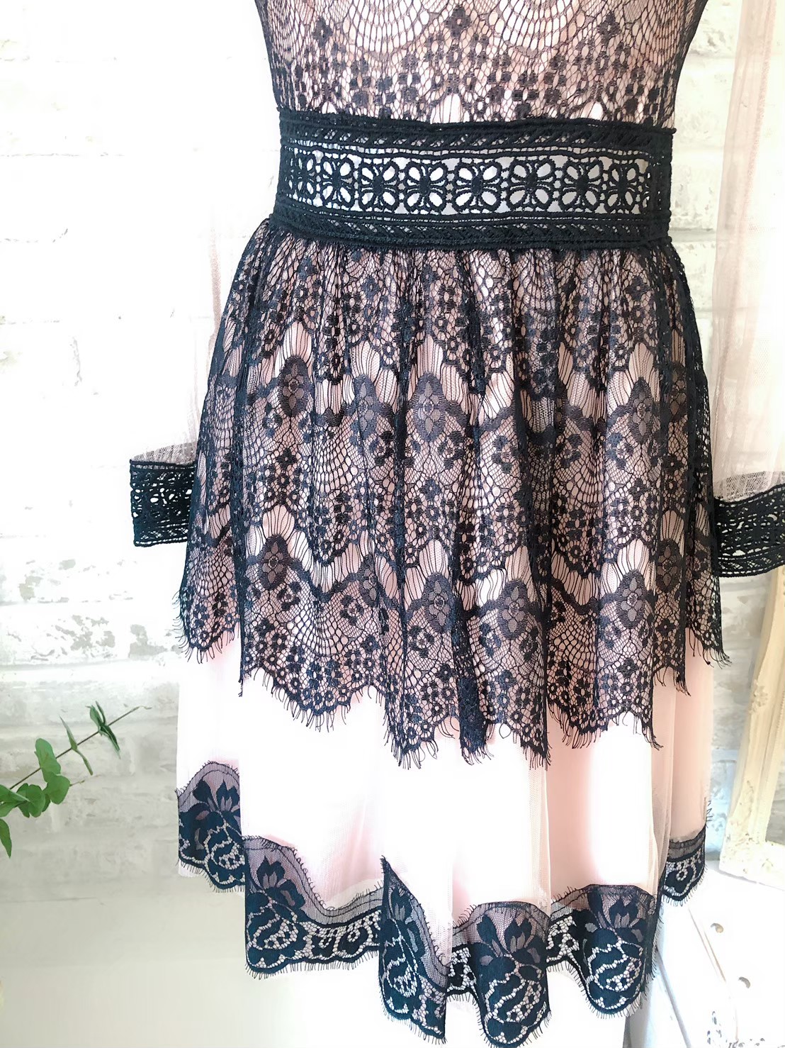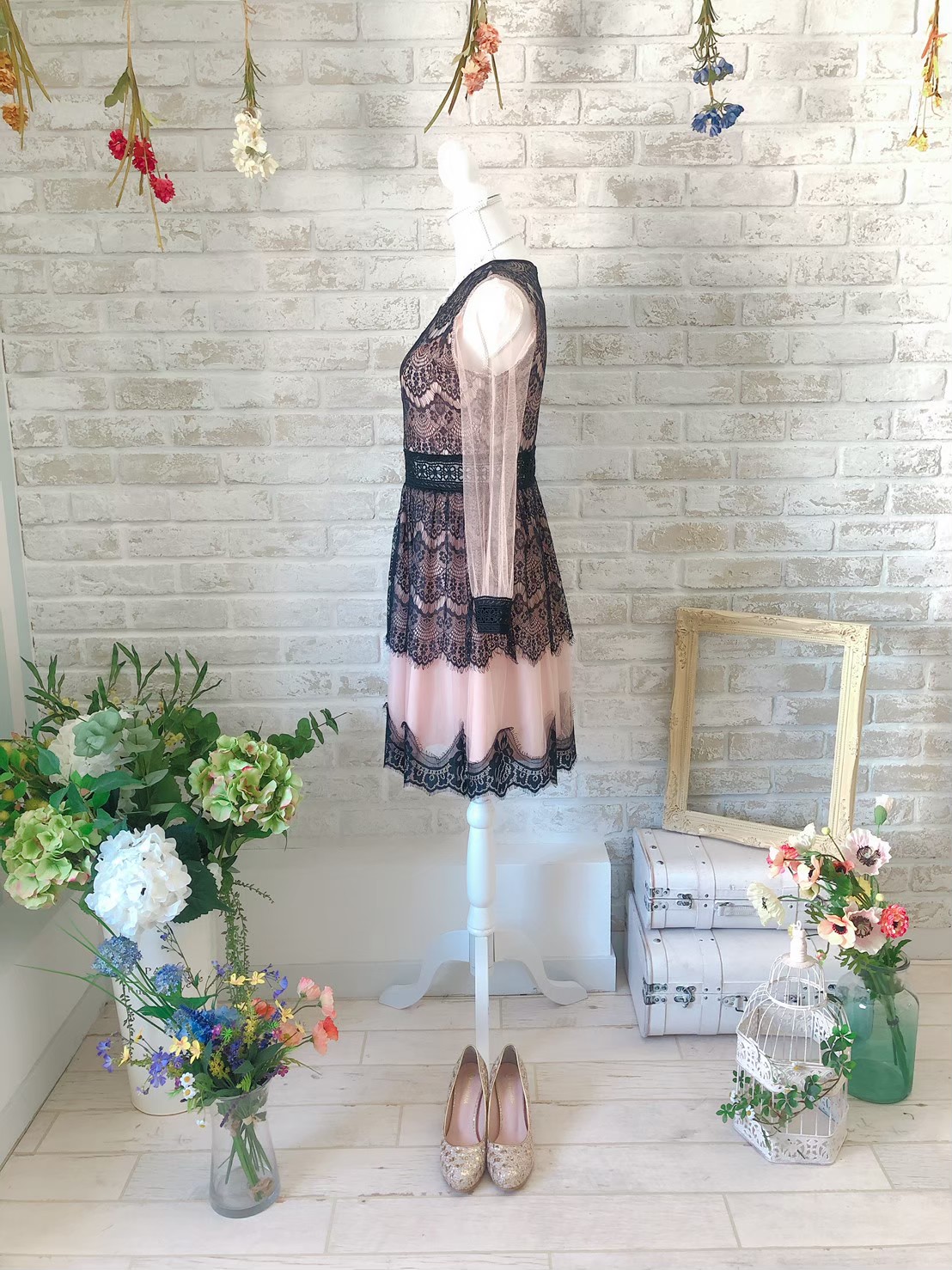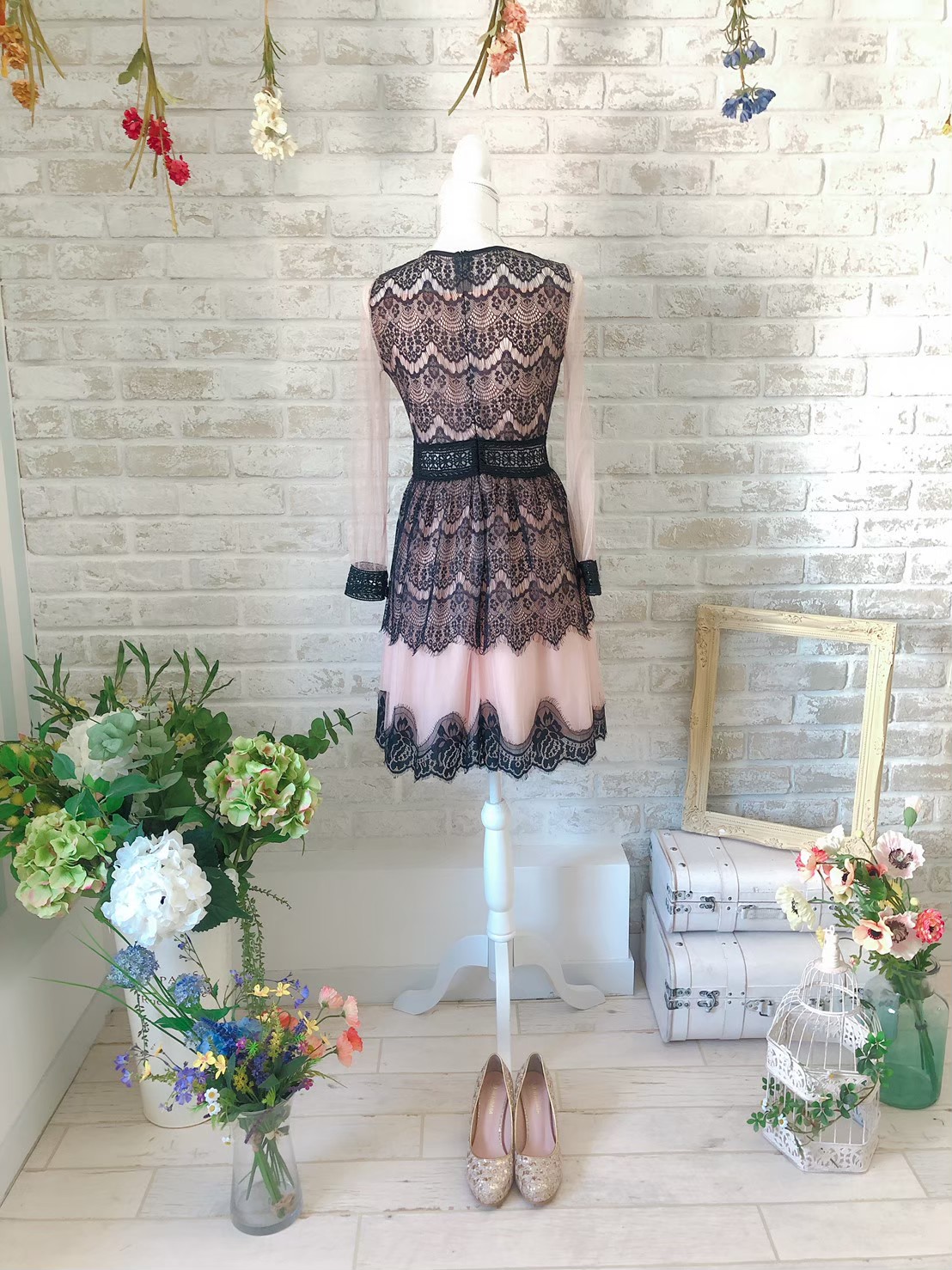 ブラックレース×ピンクベージュのフェミニンドレスです。控えめなのにレースのデザインで華やかさを演出します。 一枚着るだけでドレスアップ感のある大人女子のための素敵な一着になっています。 長袖部分がシースルーになっていてとても可愛いです。