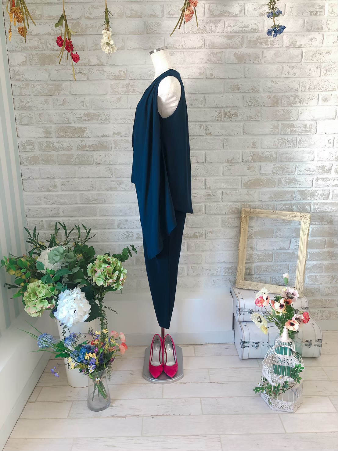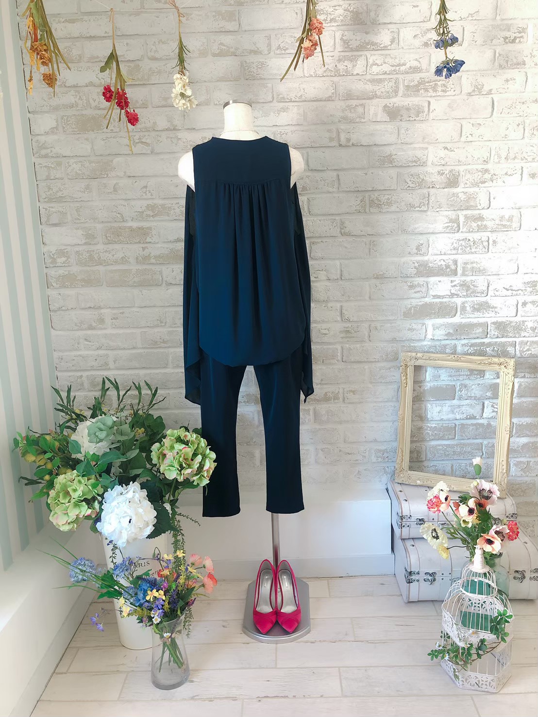 ネイビーの胸元Vカットパンツドレス。肩のフリルが可愛い印象を与えてくれます。シンプルなデザインですがトップスの裾が丸まっていてシルエットが素敵です。 Vカットが胸元をすっきりと首を長く見せてくれる効果があります。 大ぶりなネックレスをつけて華やかにも決まります。