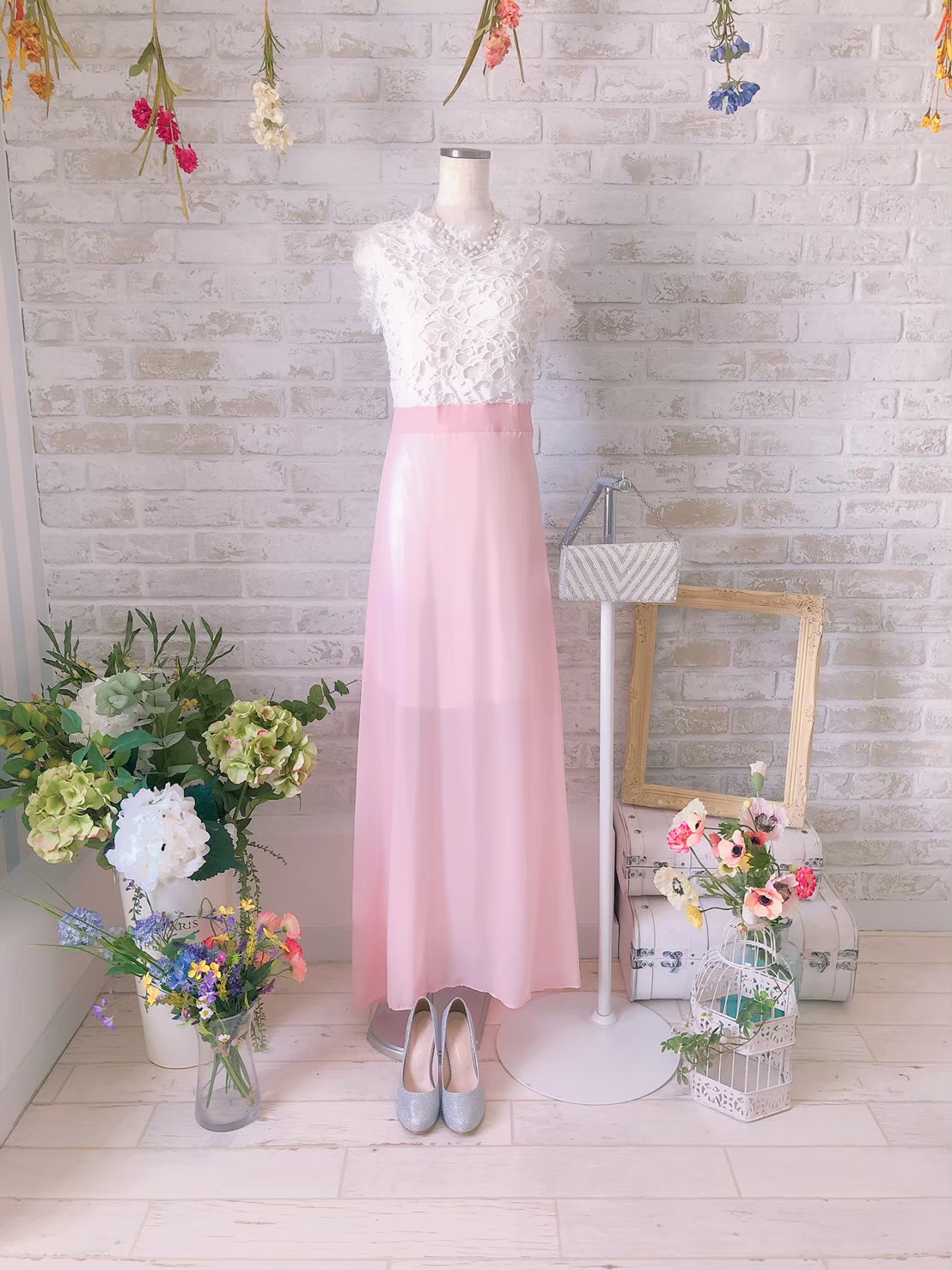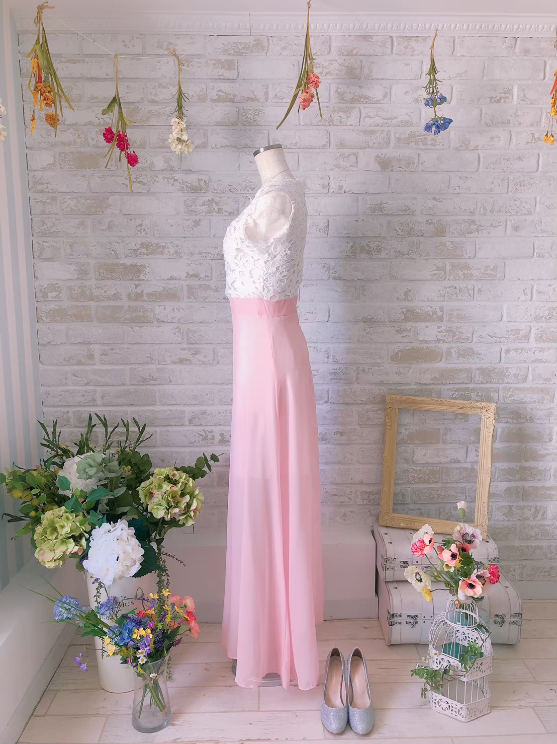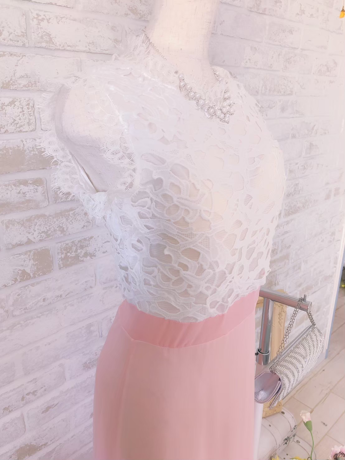 胸元は白のレース、スカート部分はピンクのシフォンのロングドレスです。とても女性らしいデザインですがスレンダーラインになりますので、大人っぽい雰囲気もあります。 スカート部分はやわらかい生地のシフォンなので透けることもありますがインナーをはけば解決です。 身に着けるアクセサリーで可愛くも大人っぽくなるドレスとなっております。 パーティーや謝恩会に是非オススメの一着となっております。
