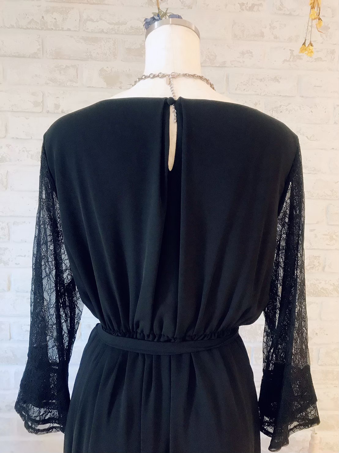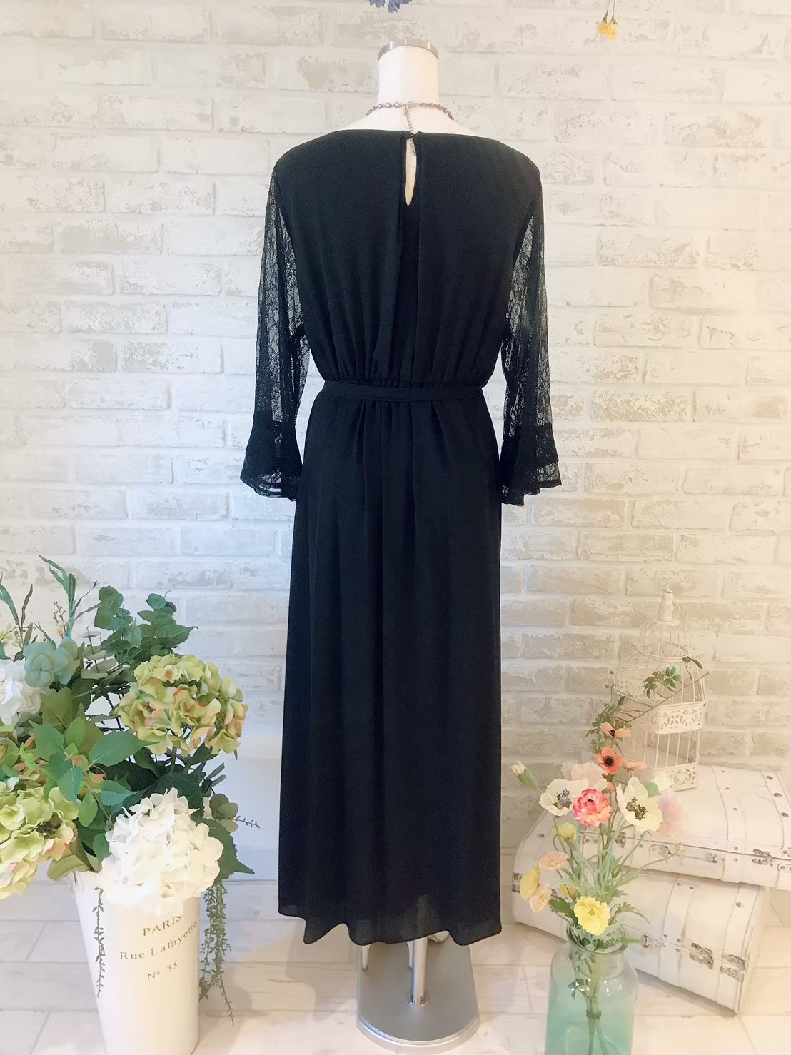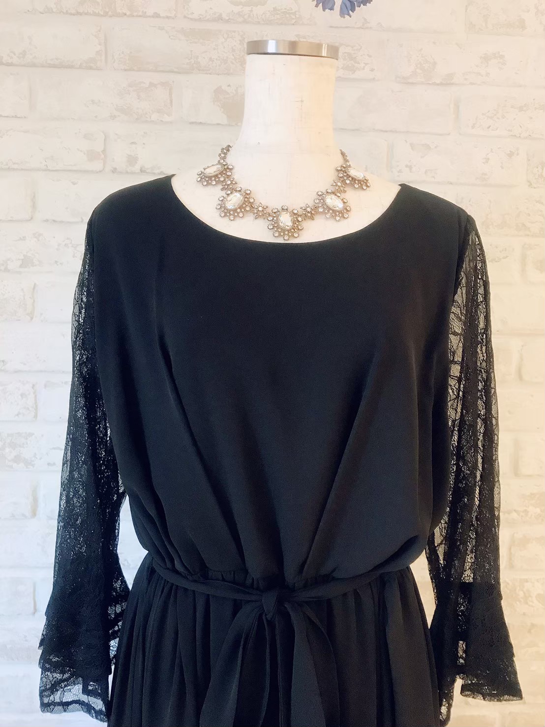 首元はUネックで女性らしい可愛らしい印象になり、鎖骨も見えてとても綺麗です。シンプルなデザインなので大きめのネックレスが良く映えるデザインになります。ウエストにはリボンがついているのでウエスト調節が可能です。丈間は長めなのでスタイルに自信のない方でも着やすく色味もブラックとネイビーの2色展開で着痩せ効果もございます。バックや靴などで色味をプラスするとより可愛らしくオシャレに着こなせます。デザインがシンプルにまとまったドレスなのでパーティや二次会、女子会などにもお使いいただけます。