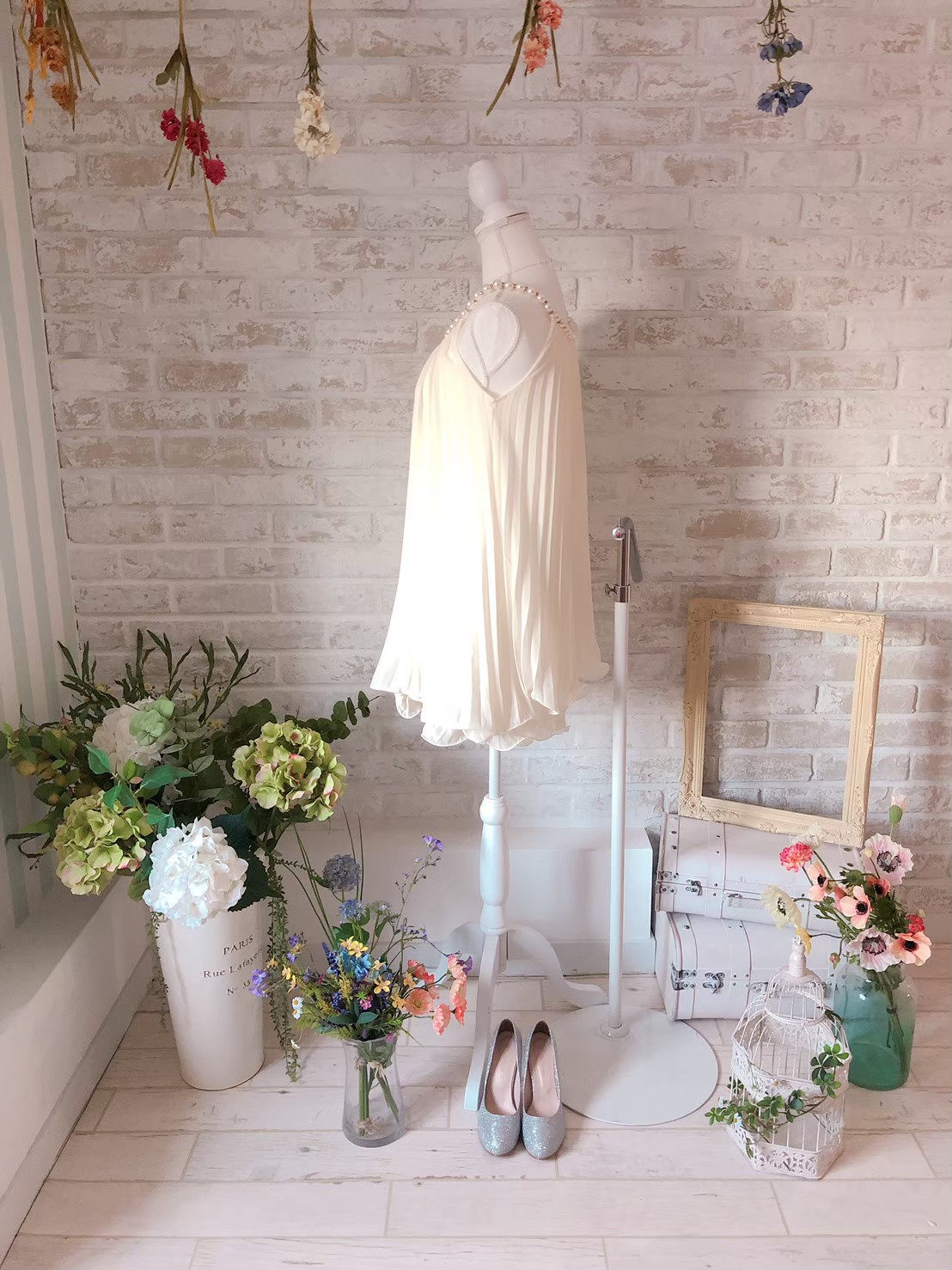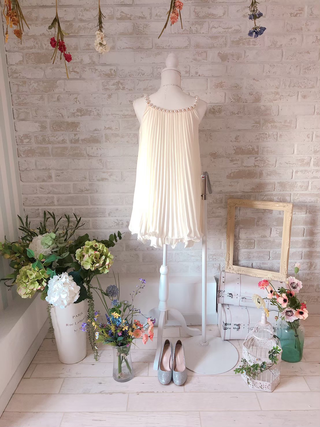 アイボリーカラーのバルーンデザインのミニ丈のドレスです。プリーツ×バルーンで、体型カバー効果も◎ 首元には大きなパールが施された可愛らしいデザインとなっております。 色違いで、水色やベビーピンクもありますので色違いでお友達とお揃いコーデも出来ます。 首元には大きなパールが付いてるのでなくても充分なので耳元に大ぶりなものでアクセントつけるのがベター。 ヘアスタイルはアップやサイドアップがオススメです。