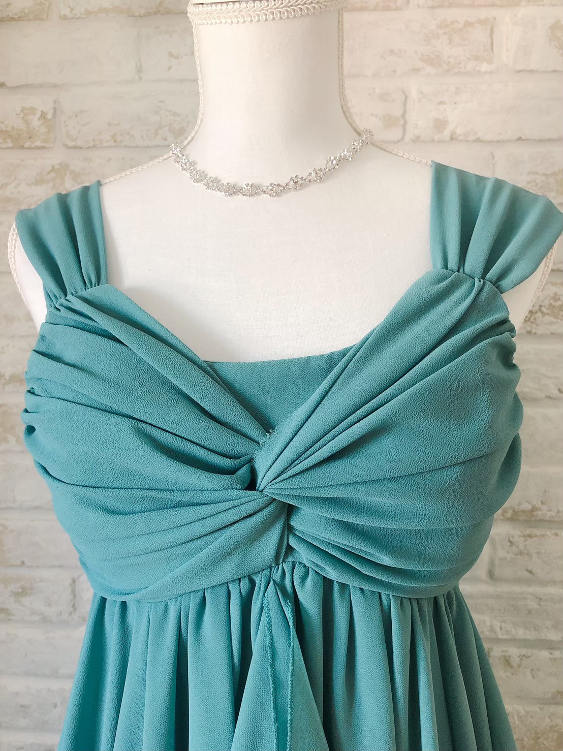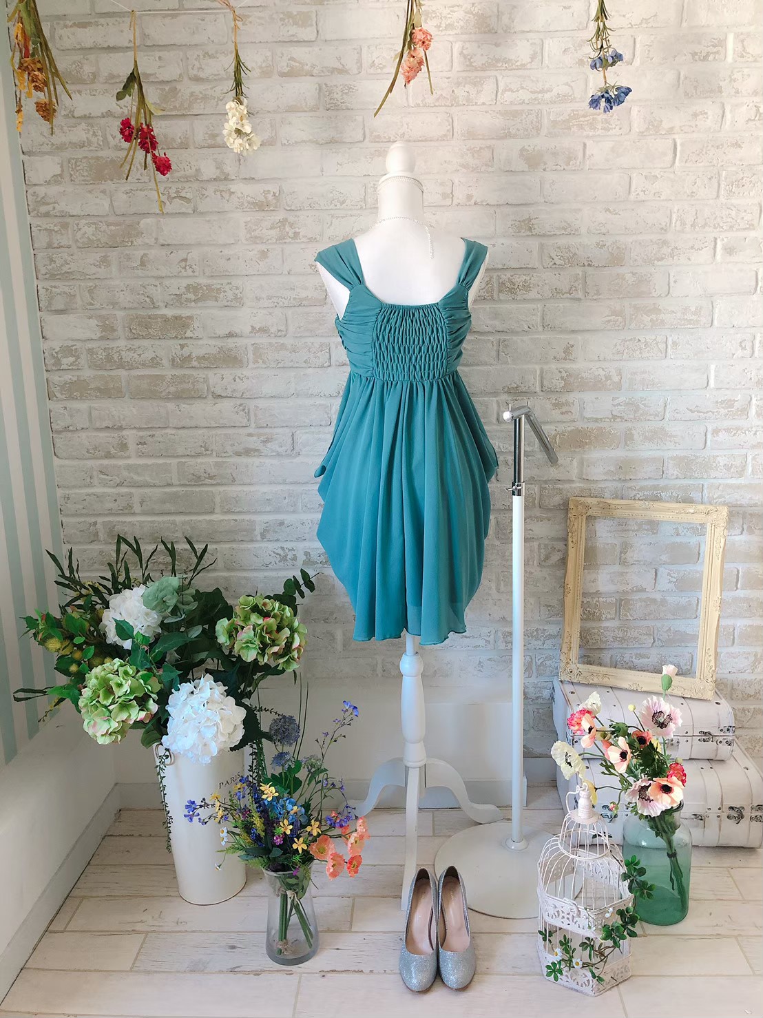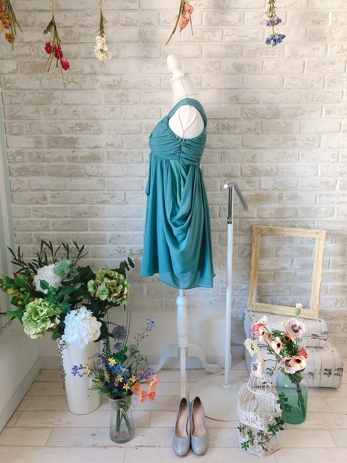 くすみ系グリーンのふんわりとしたキュートなドレスです。色味が落ち着いているので、幅広い年代の方に着ていただけるドレス。 胸元のクシュッとしたデザインも可愛い雰囲気を◎。 アクセサリーやバッグも、どんなものとも相性が良く自分好みのコーディネートをお楽しみ頂ける一着となっております。 ヘアスタイルはダウンスタイルや、ハーフアップ、サイドアップなどオススメです。 キュートな雰囲気な中にエレガントさをプラスできます。 結婚式参列ドレス~謝恩会までと幅広くお使い頂けるドレスです。