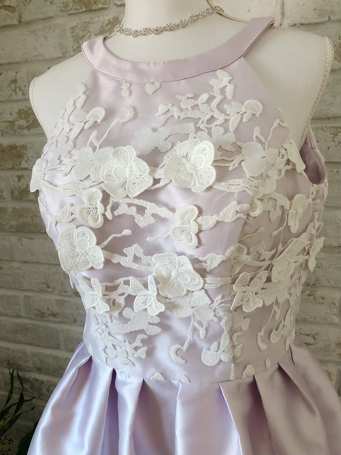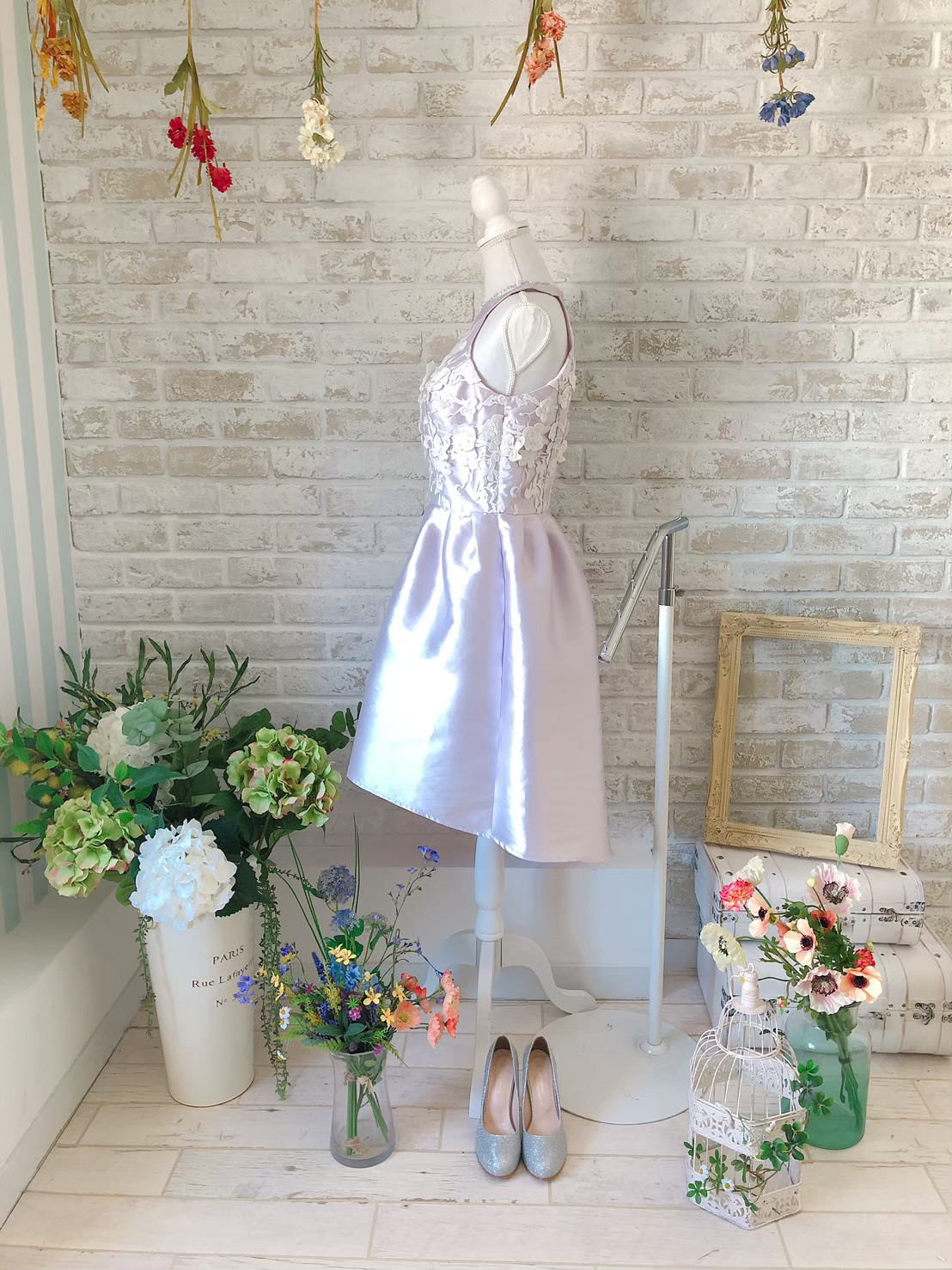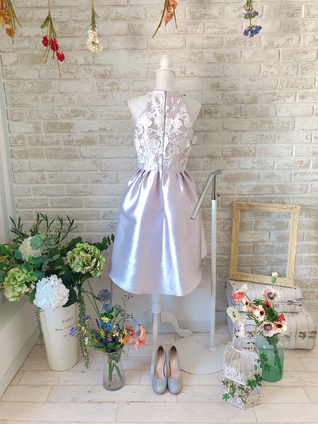 パステルなラベンダーカラーであまり見かけないお色味なので他の方と被りにくく、胸元に施されている可愛らしい花柄が特徴的なドレスです。パステルカラーなので春の結婚式や二次会、パーティーや謝恩会で活躍すること間違いなしです。丈間も短すぎないのでゲスト参列ドレスとしても使えます。少し濃いめなビビットカラーなピンクなどの同系色を小物で持ってくるととても可愛らしくオススメなコーディネートです。