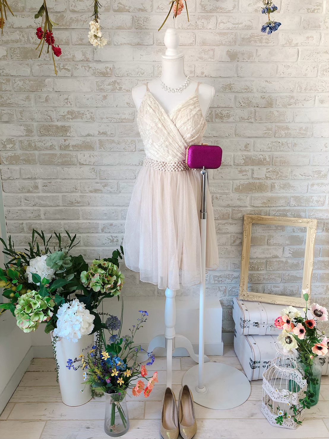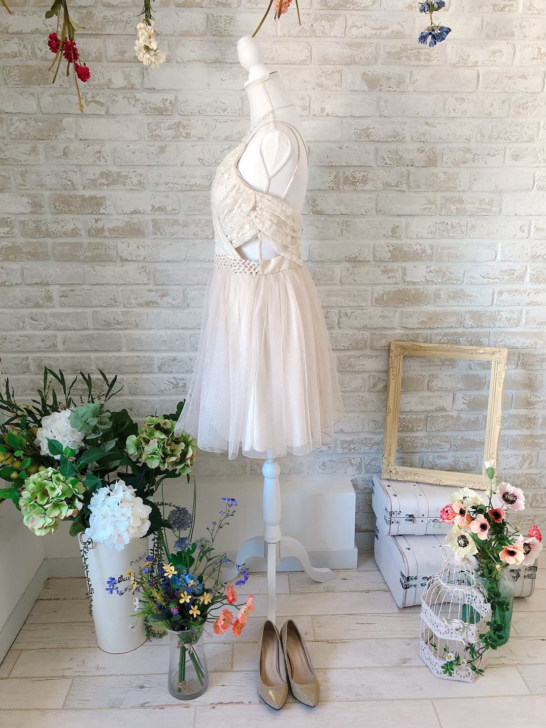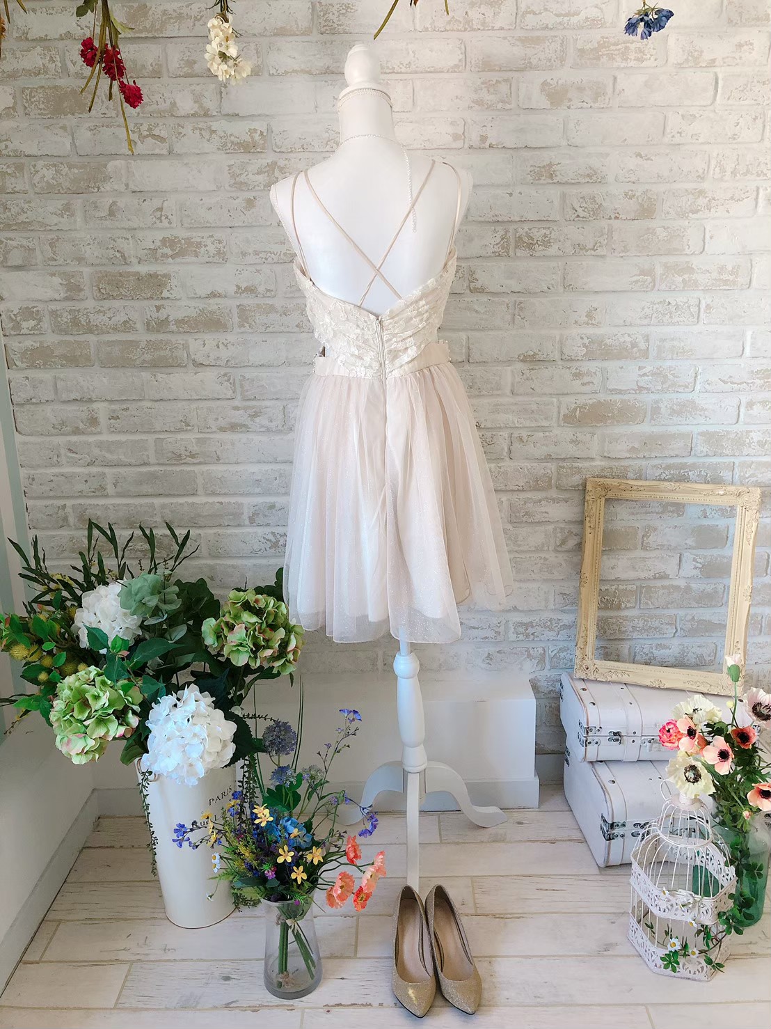 ベージュの、レースや、チュール、パールのデザインが女性らしさ抜群のドレスです。レースとチュールの切り替えになっており、切り替え部分にはパールとビジューがあしらわれた豪華なデザインな一着となっております。 背中部分はクロスデザインのキャミソールでセクシーさを。 ボレロやストールを羽織れば背中は隠れるので、ゲスト参列ドレスとしても◎。 華やかなデザインですので、パーティーや謝恩会などにもいかがでしょうか。