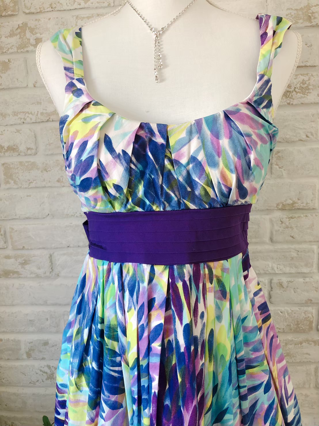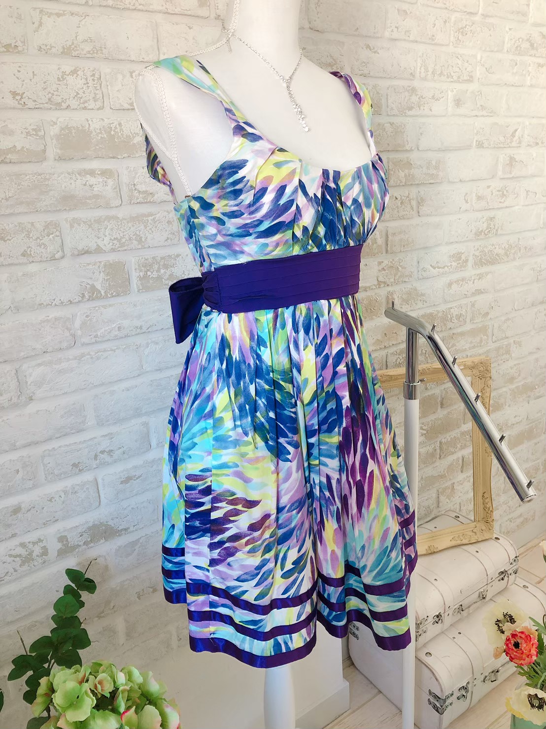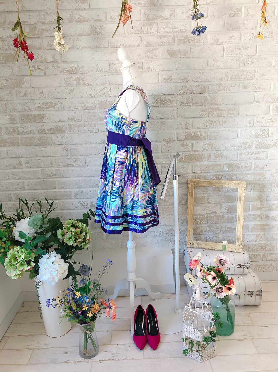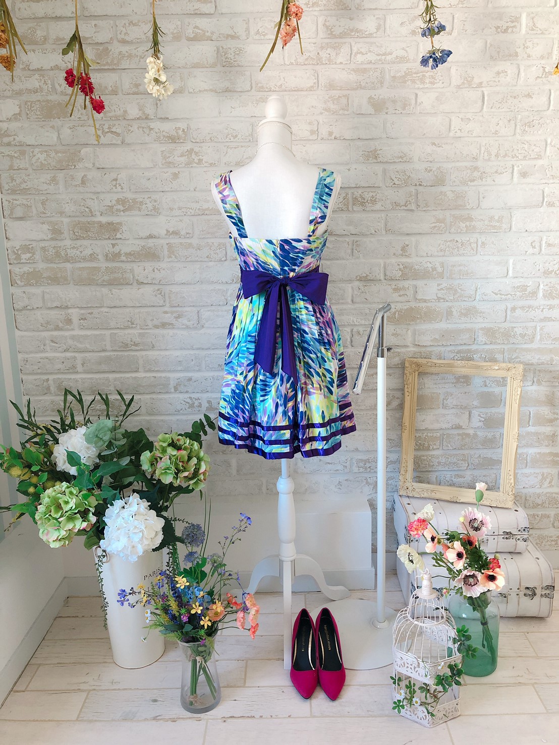 パステルブルーから、パープルまでと幅広い色味が使われた水彩画のような可愛いドレスです。キャミソールAラインでとっても女の子らしいデザインです。 ドレスだけで充分な存在感がある為、バッグはあえて控えめに・・ アクセサリーはパールもビジューも両方相性抜群です。 ミニ丈なので脚長効果抜群!! ちょっとしたお食事会、パーティーや謝恩会、夏のゲスト参列ドレスとしていかがでしょうか。
