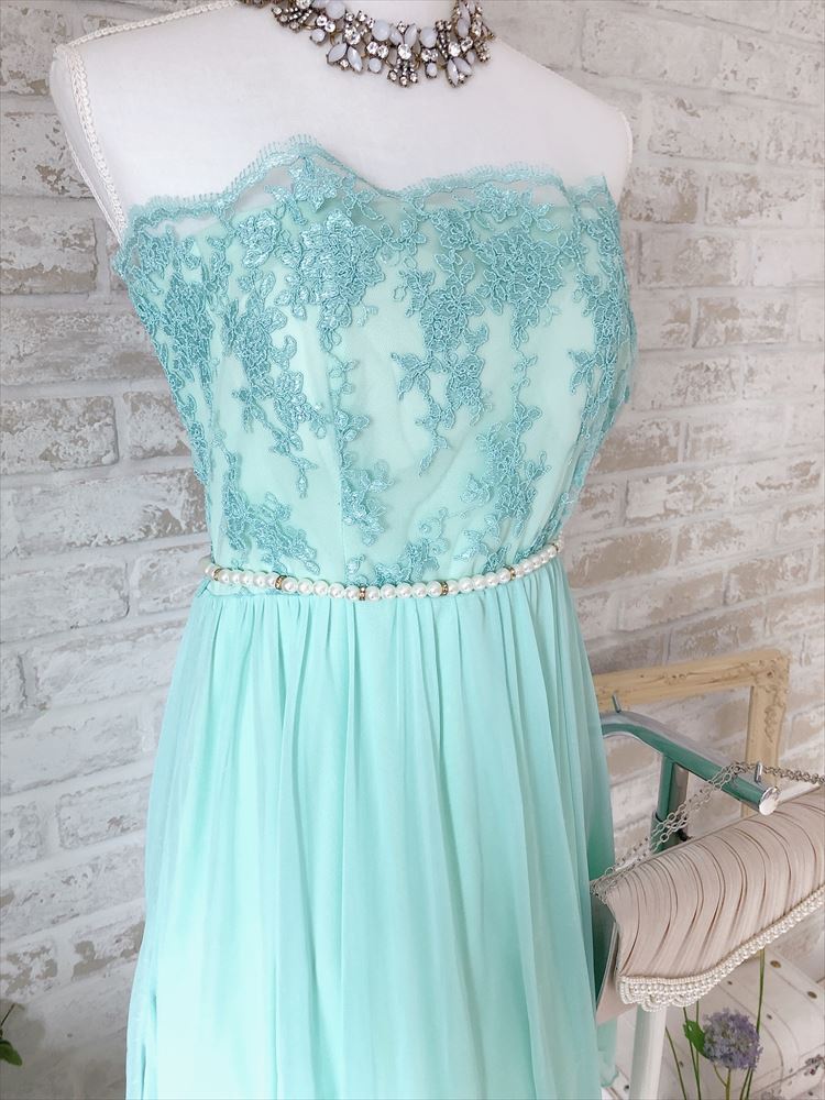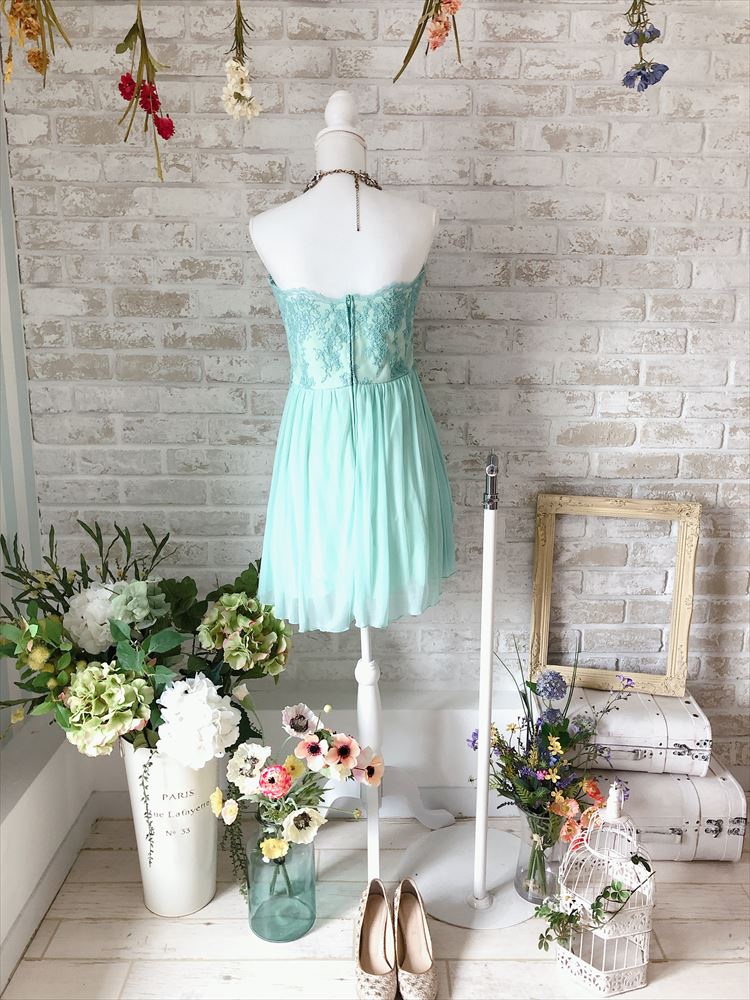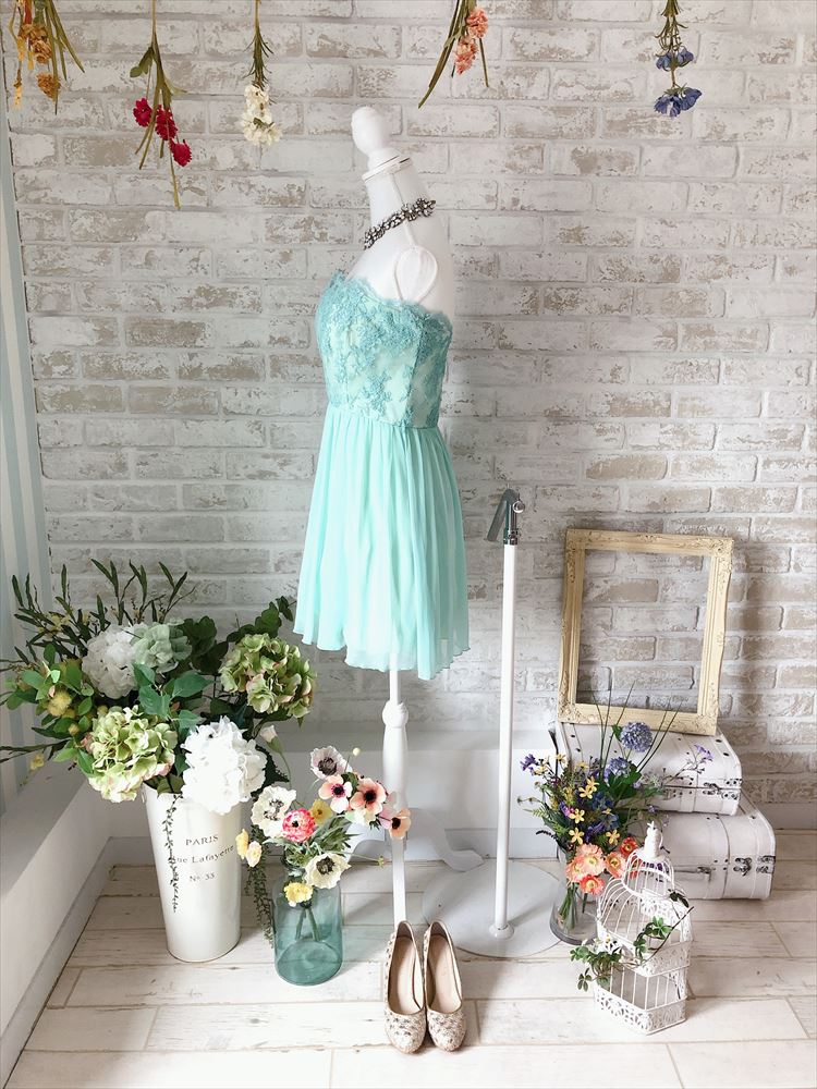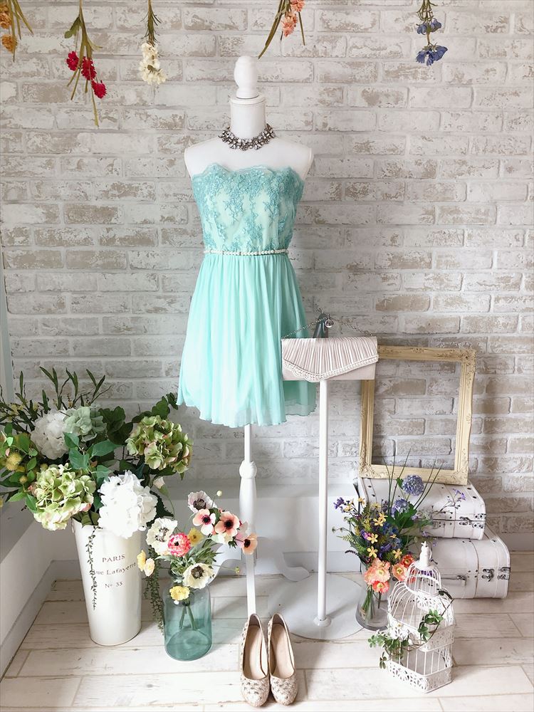 胸元のレースがとってもキュートな印象を与えてくれるパステルグリーン系の優しいお色味のベアドレスです。別でレンタル可能なパールのチェーンベルトを付け加えればさらに可愛さUP。スカート部分はひらひらと揺れるシフォン素材になっております。