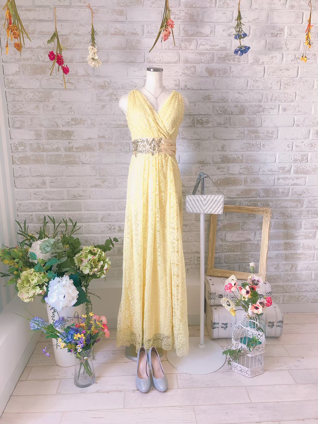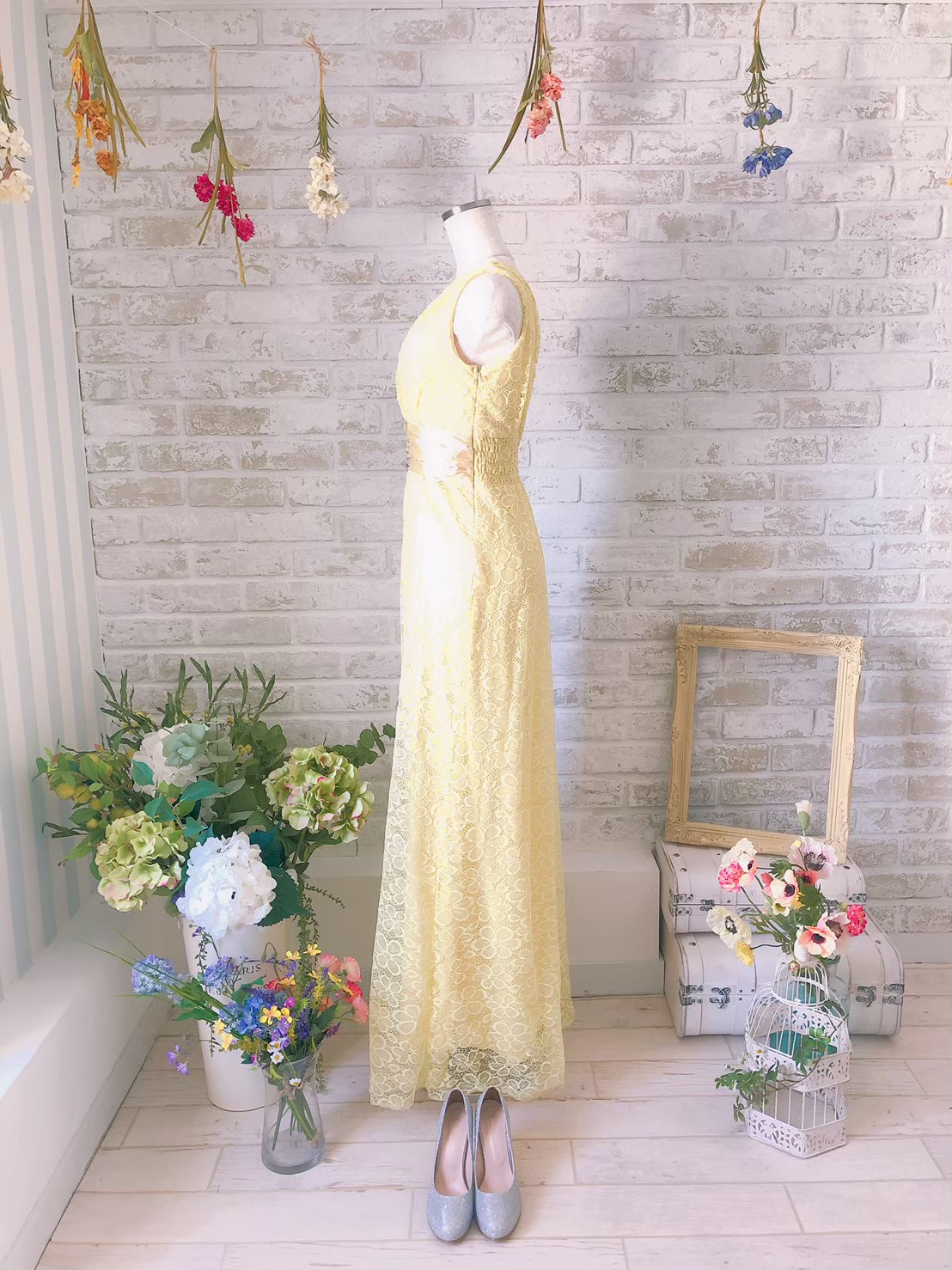 お花レースとパステルイエローが可愛らしいロングドレスです。ウエスト部分にビジューがあしられているのもポイント★ とても可愛らしいデザインには、パールが良く合いますので、アクセサリーは、パールのネックレスやイヤリング・ピアスがオススメです。 パーティーや結婚式二次会、カラードレスとしていかがでしょうか。