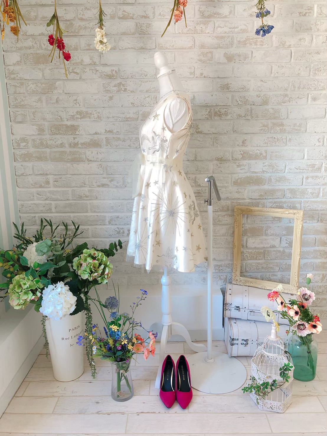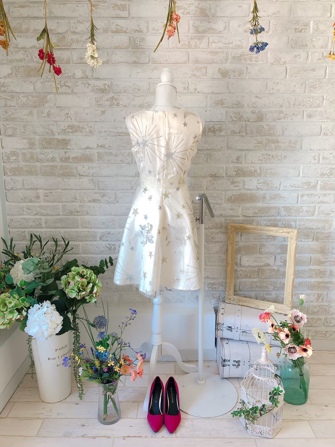 ユニコーンの刺繍がメルヘンチックでとても可愛らしいノースリーブドレスです。優しい色合いですが刺繍がゴールドとシルバーで施されているので パーティーや謝恩会に大活躍です。 黒の羽織ものをすればゲスト参列ドレスとしてもご利用頂けます。 他にはないデザインなのでレンタルだからこその冒険もお楽しみください。