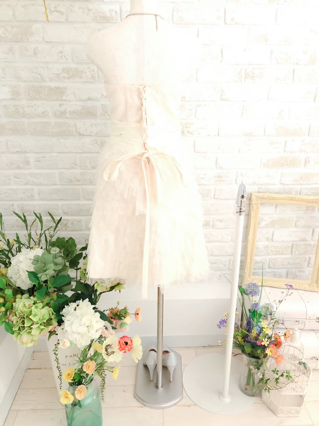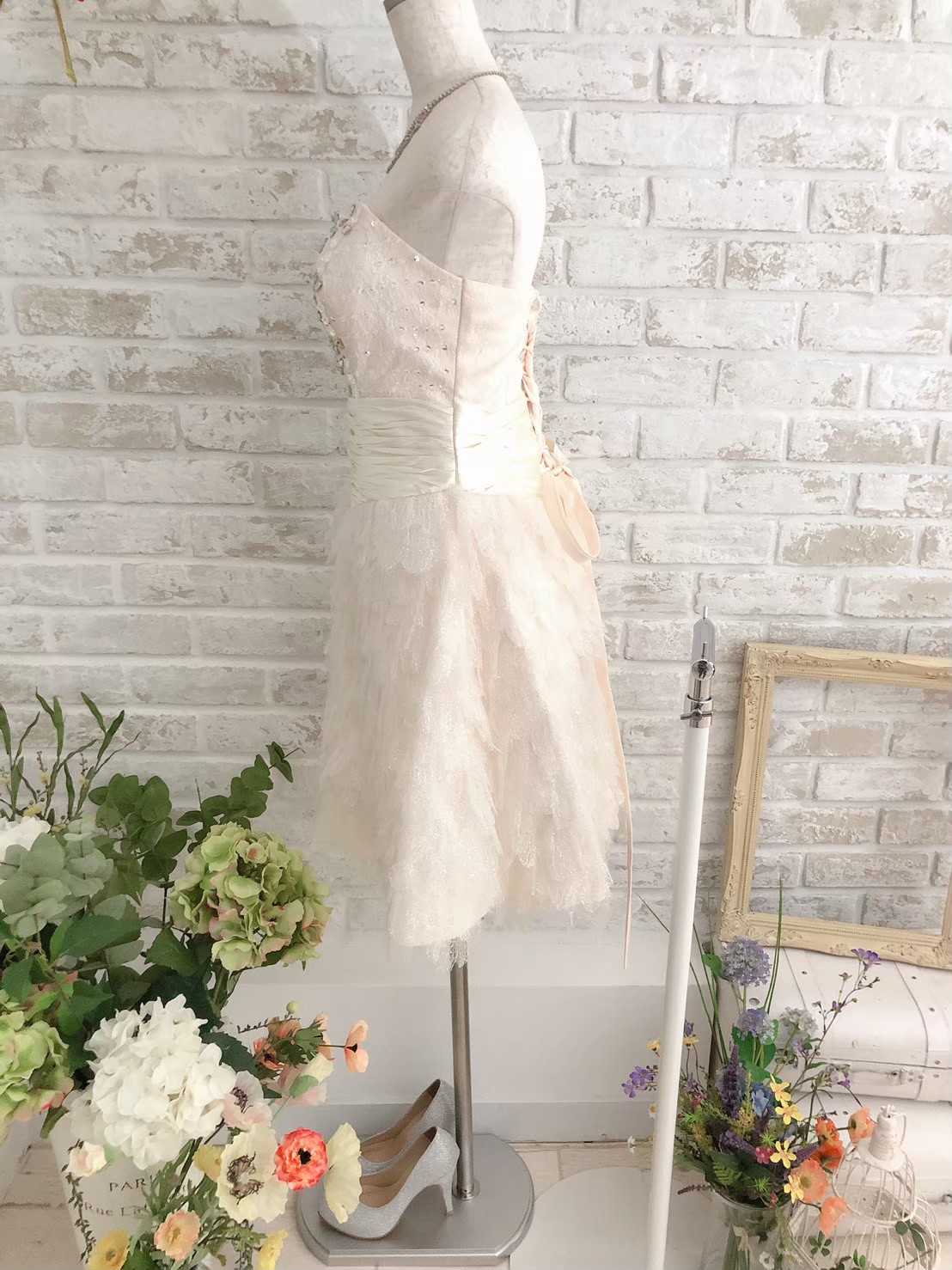 “アイボリーカラーのベアドレスです。フェザー風のスカートは他にはないデザインです。