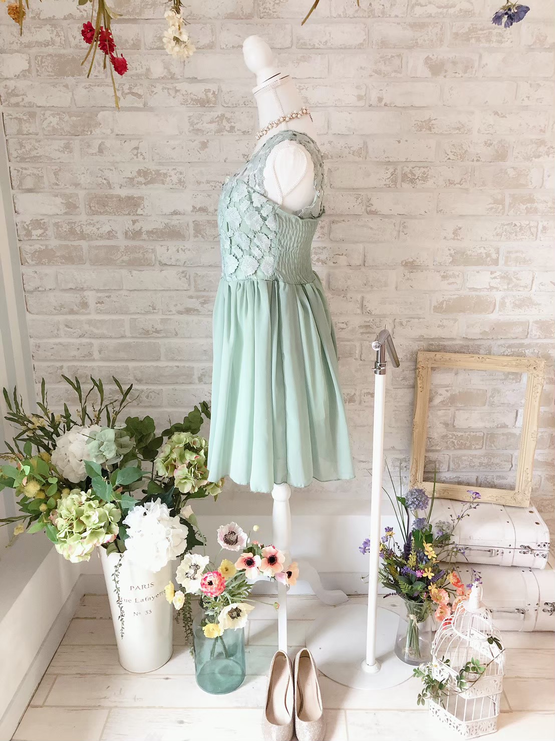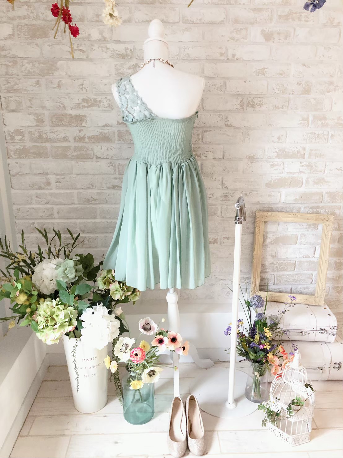 モスグリーンの可愛い×きれいめなワンショルダータイプのドレスです。お花のレースにシフォン・・ とっても女の子らしいデザインのドレスです。 羽織ものをしたら、ワンショルダーなのは隠れるのでゲスト参列ドレスとしてもお使い頂けます。 アクセサリーはパール、ビジュー両方相性抜群です。 バッグはあえてのイエローや、ピンクを合わせると華やかさもプラスされ、さし色にもなるのでオシャレ上級者の仲間入り★ ゲスト参列ドレス、パーティーや謝恩会にいかがでしょうか。