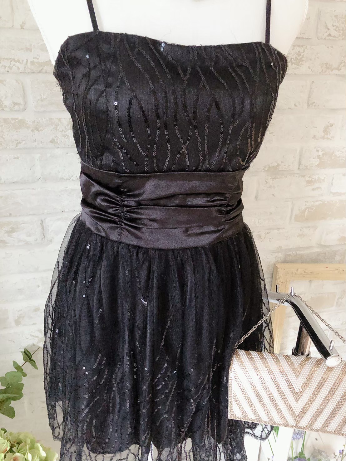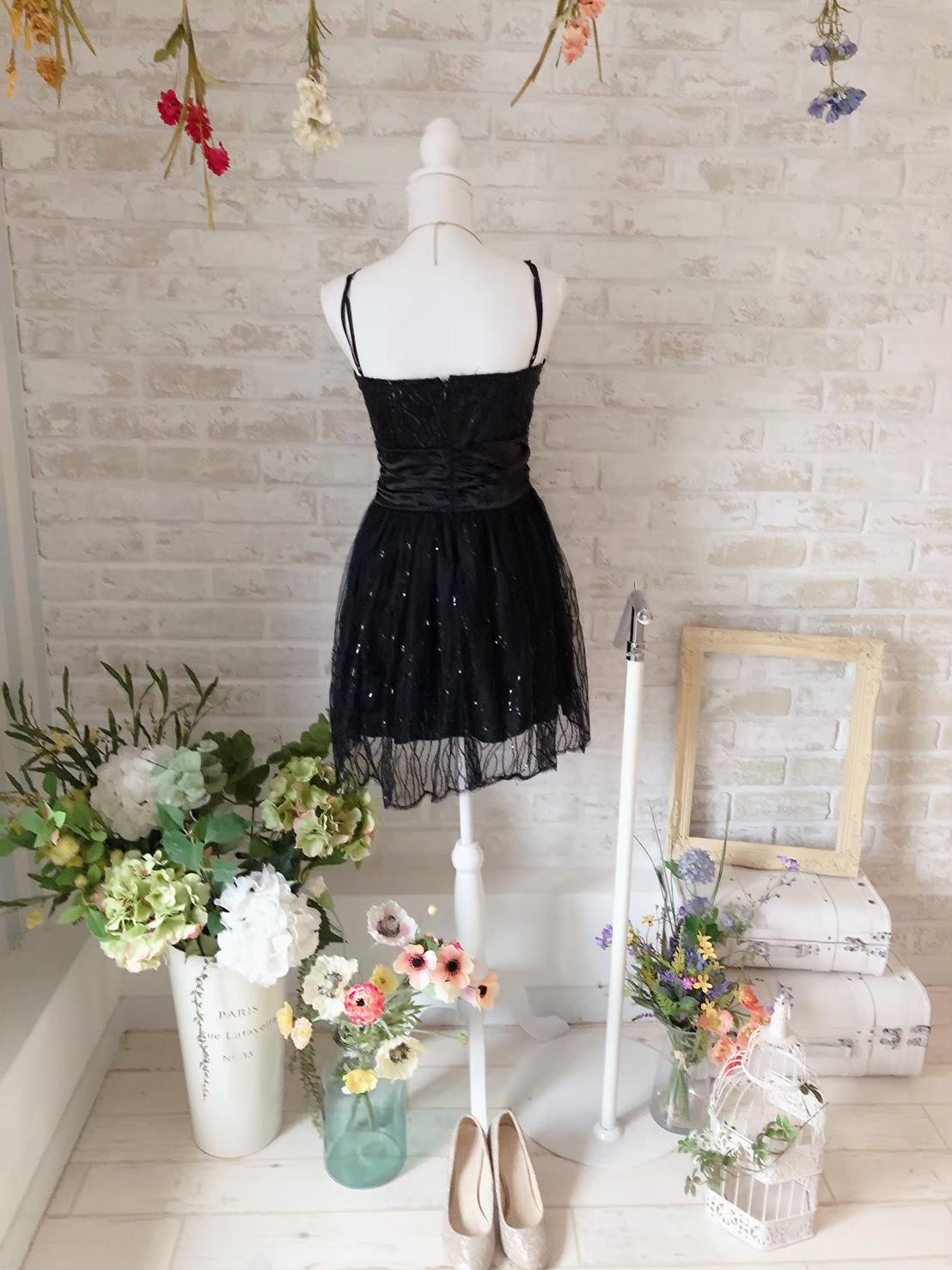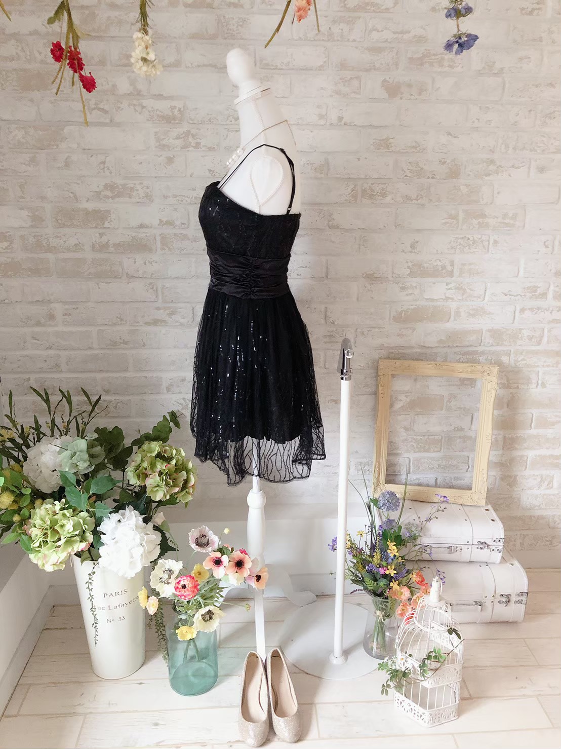 ブラックカラーのキャミドレス。シンプルなベアトップでスカート部分がふんわり広がっていて…