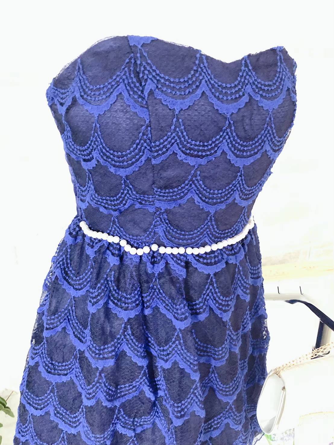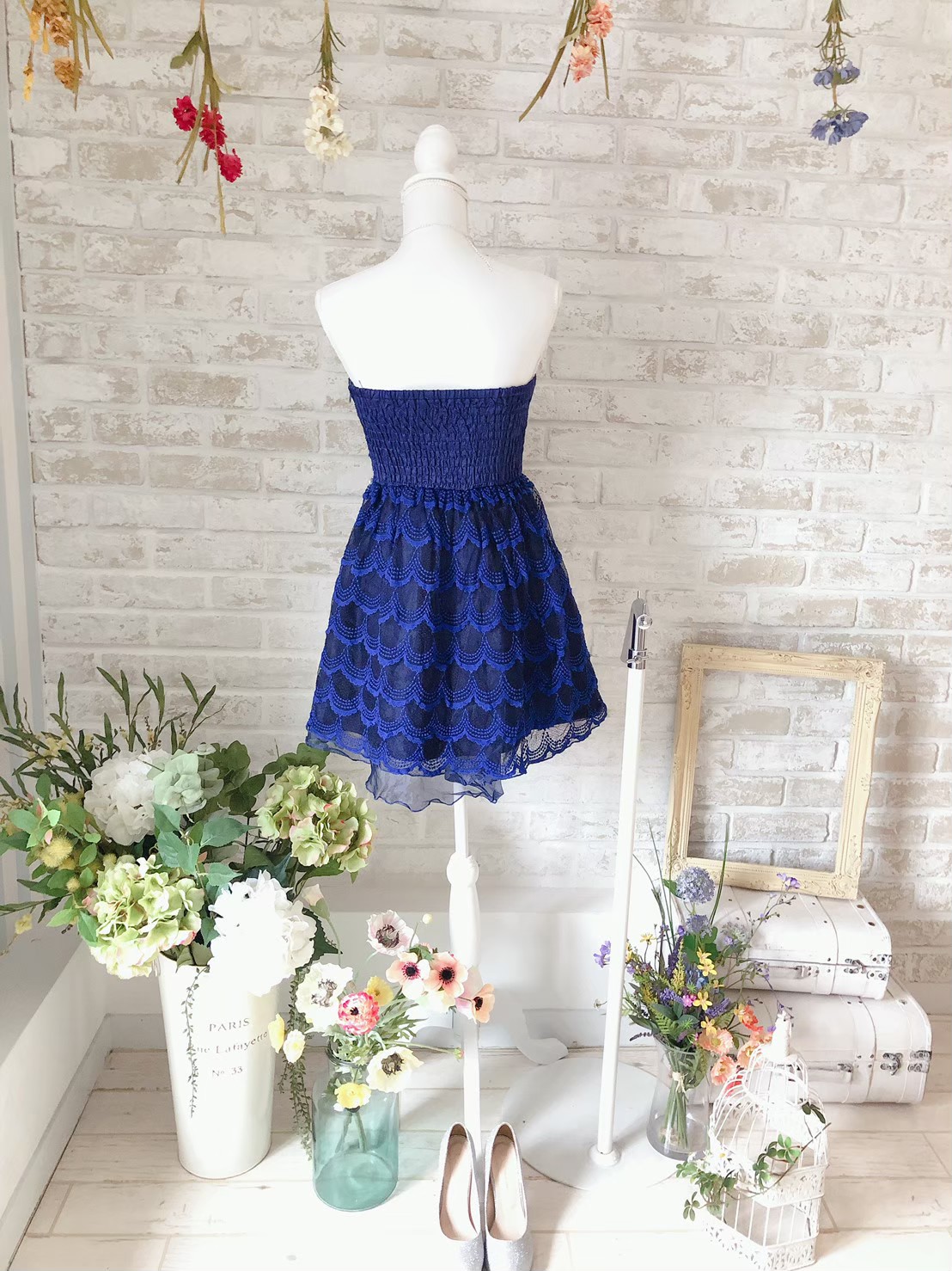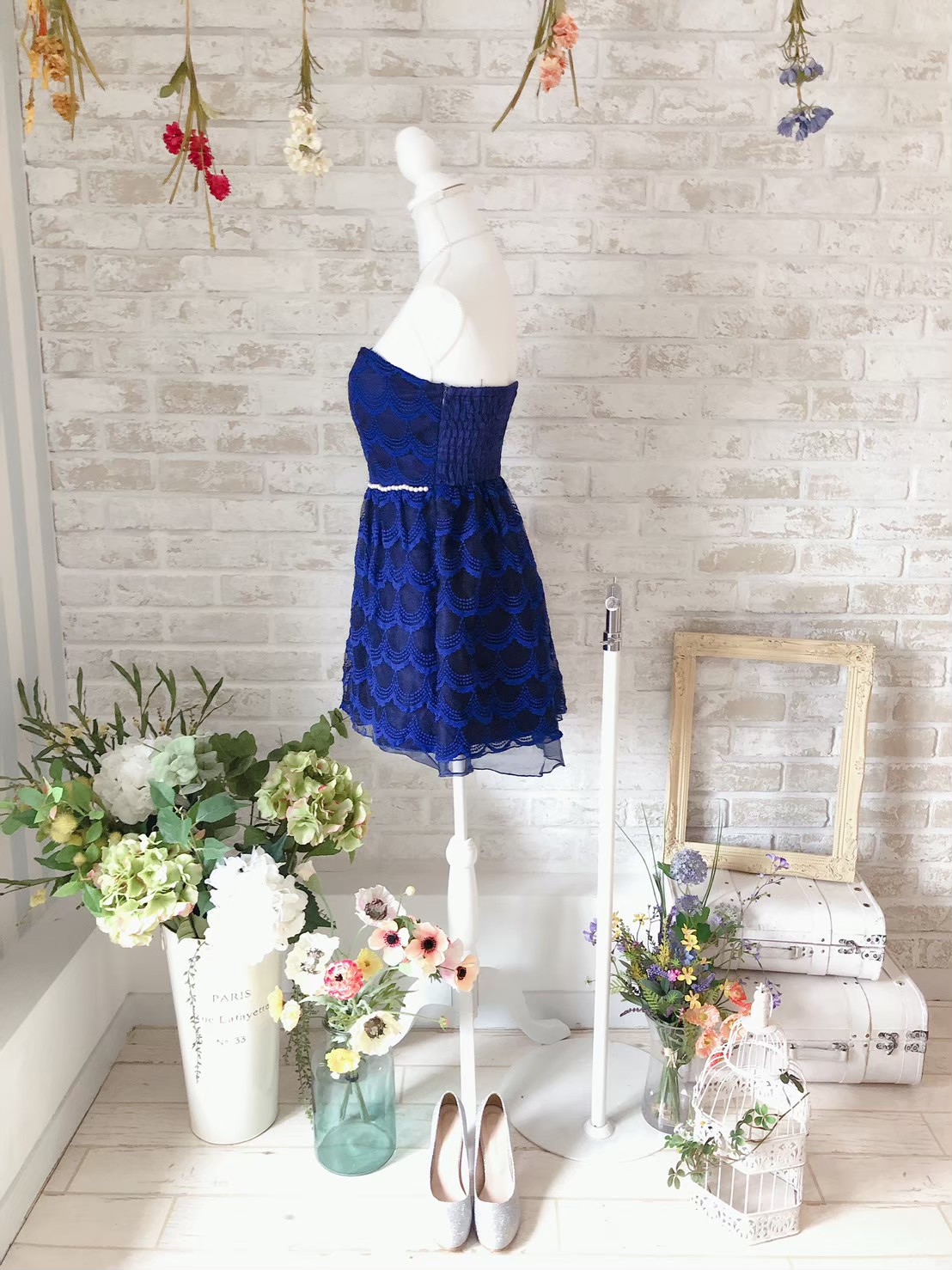 ウエストにパールが施されたネイビーベドレス。シンプルなベアトップでスカート部分がふんわり広がっていて…