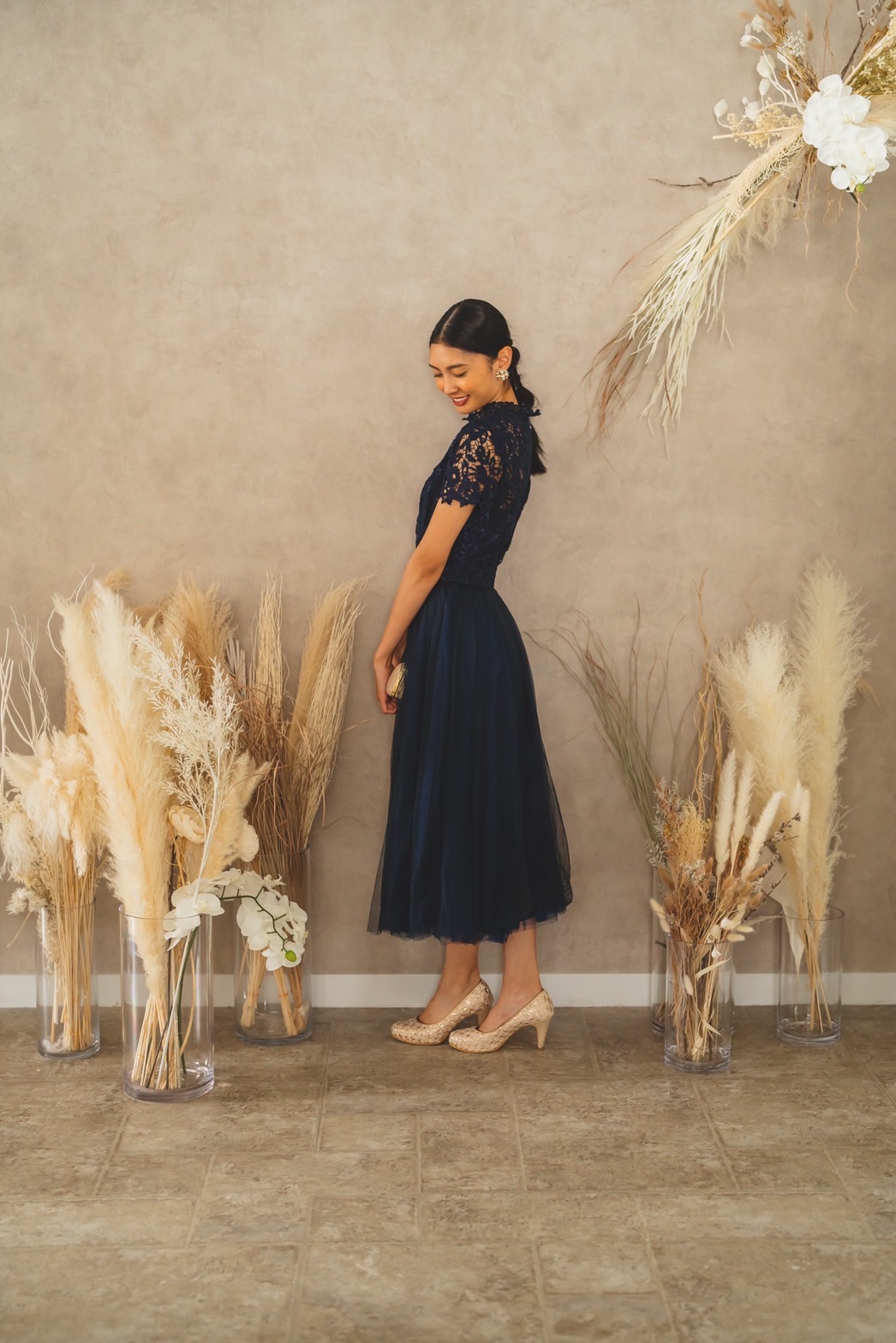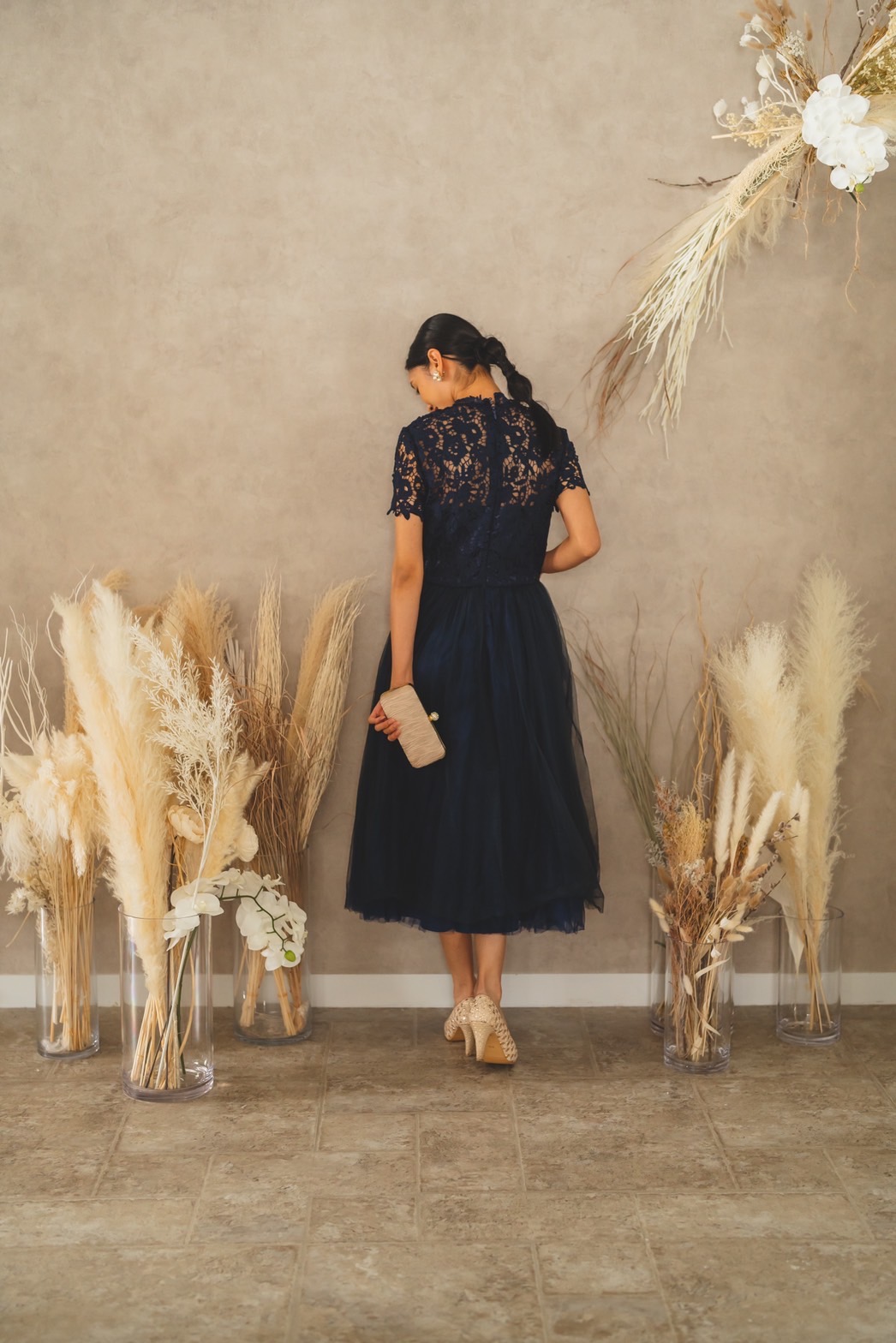 首元までレースのハイネックタイプのネイビードレスです。スカート部分はふんわりとしたチュール素材でAラインとなっております。 可愛らしいデザインですがネイビーカラーで甘さ控えめなところもGOOD!! シンプルなアクセサリーを付ければ清楚な雰囲気に。パールなどを合わせれば大人コーデの出来上がりです。 バッグをピンクやイエローなどカラーものを合わせると一気に華やかさがプラスされます。