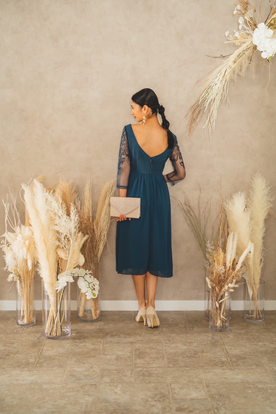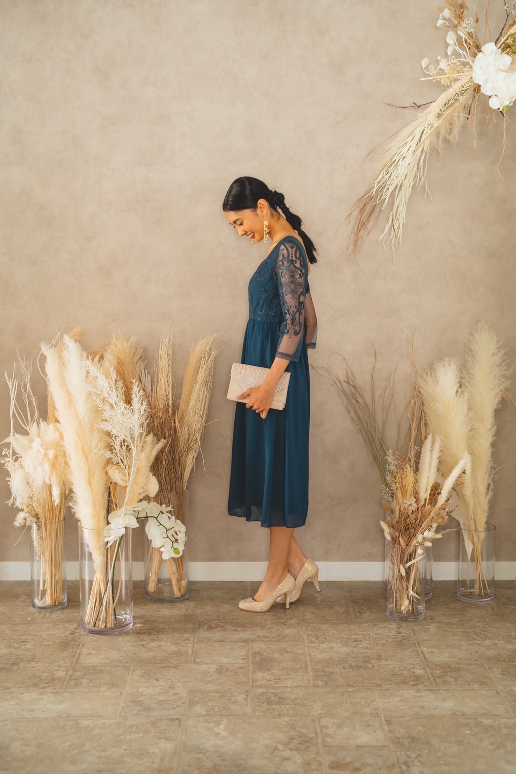 大人気の袖ありドレスです。カーキに近いような色味で落ち着いた雰囲気のドレスです。胸元はハートカットになっていて女性らしいデザインです。 エンパイアラインとなっていますのでマタニティードレスとしてもお使い頂けます。 胸元が空いてるドレスなのでY字デザインのネックレスと相性抜群です。 羽織ものはストールがオススメ。もちろんドレス一枚でもOKです。