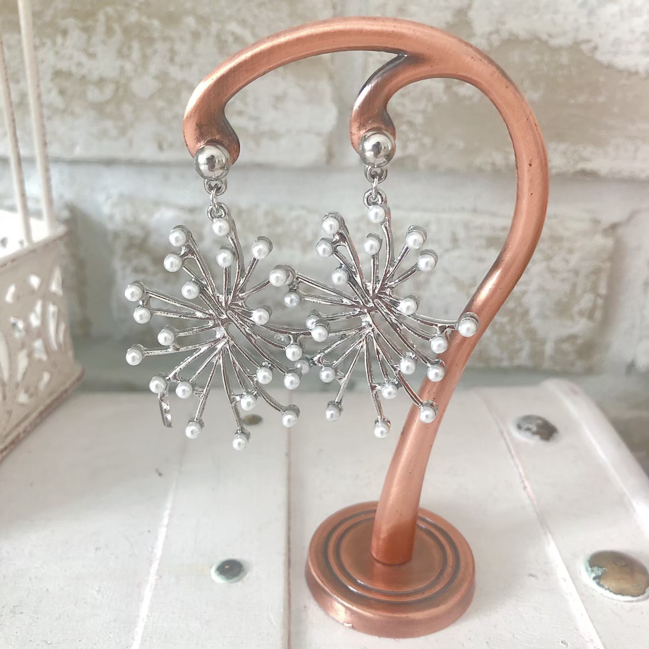 <商品詳細>小さなパールが散らばったようなデザインの個性的な大振りピアスです。