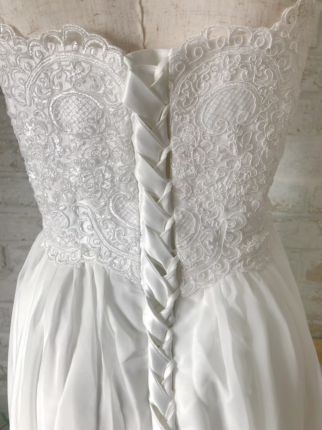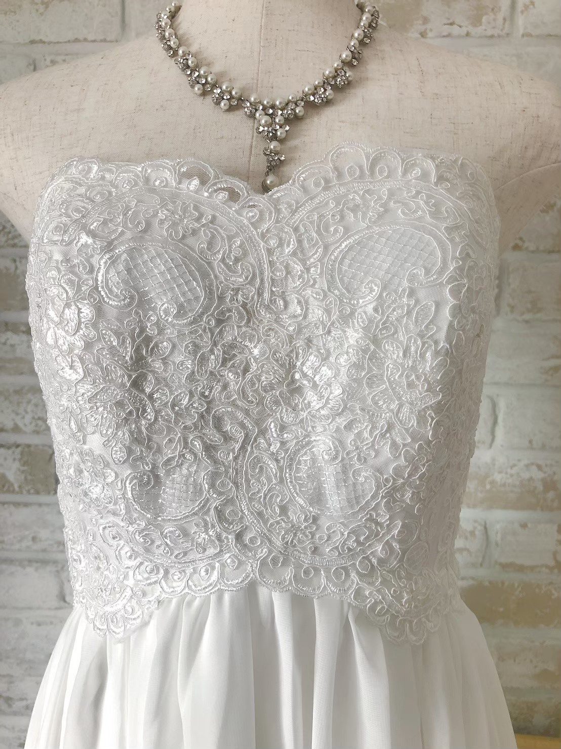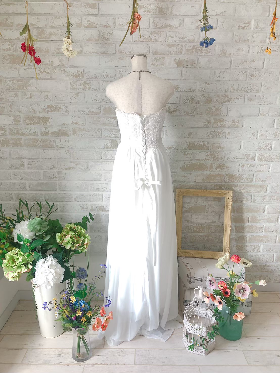 ウエスト部分から切り替えのデザインは清楚な雰囲気、キュートな雰囲気があります。 合わせるアクセサリーではエレガントさもプラスされ、どんなシーンにも大活躍致します。 真っ白なウエディングドレスは花嫁様の純真さもプラスされますので、ウエディングにはぴったりなドレスとなっております。 軽めな生地ですので、結婚式二次会や1.5次会などにもオススメの一着となっております。