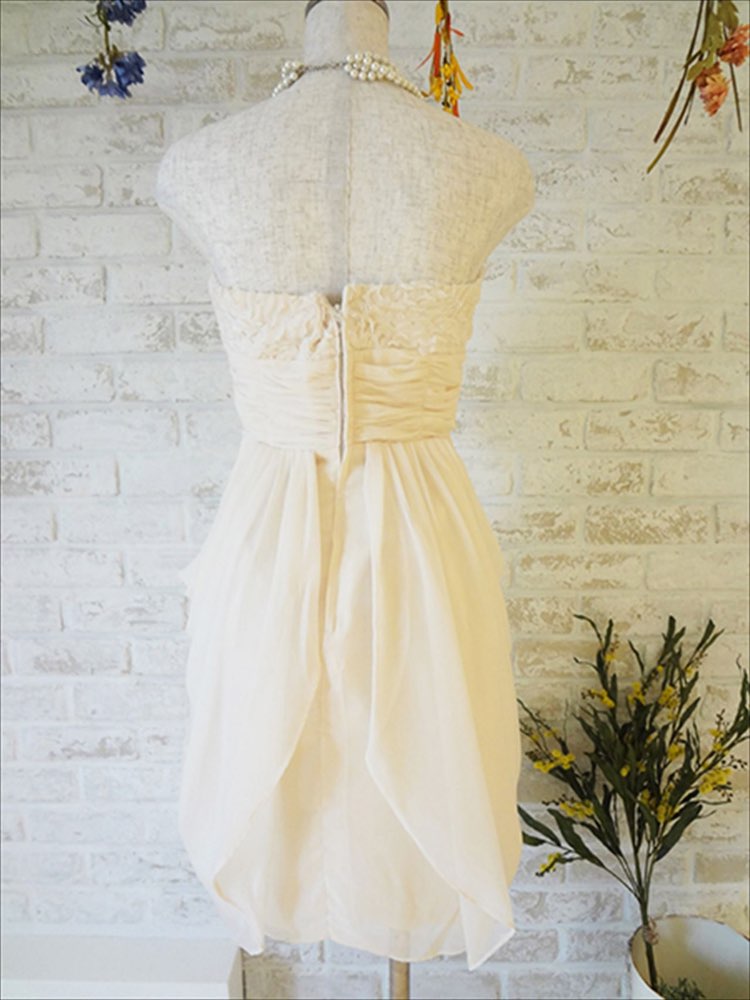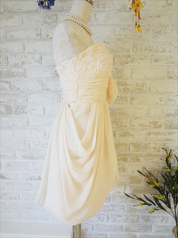 ウエディング用ミニドレス。2次会用に人気のあるシンプルなミニドレスです。胸元が花柄のレースでウエストにもデザインがあってスカートはフリルで女性らしい可愛いドレスになっております。アクセサリーはパール系と相性が良く、バックも派手過ぎない白やベージュと相性がいいです。