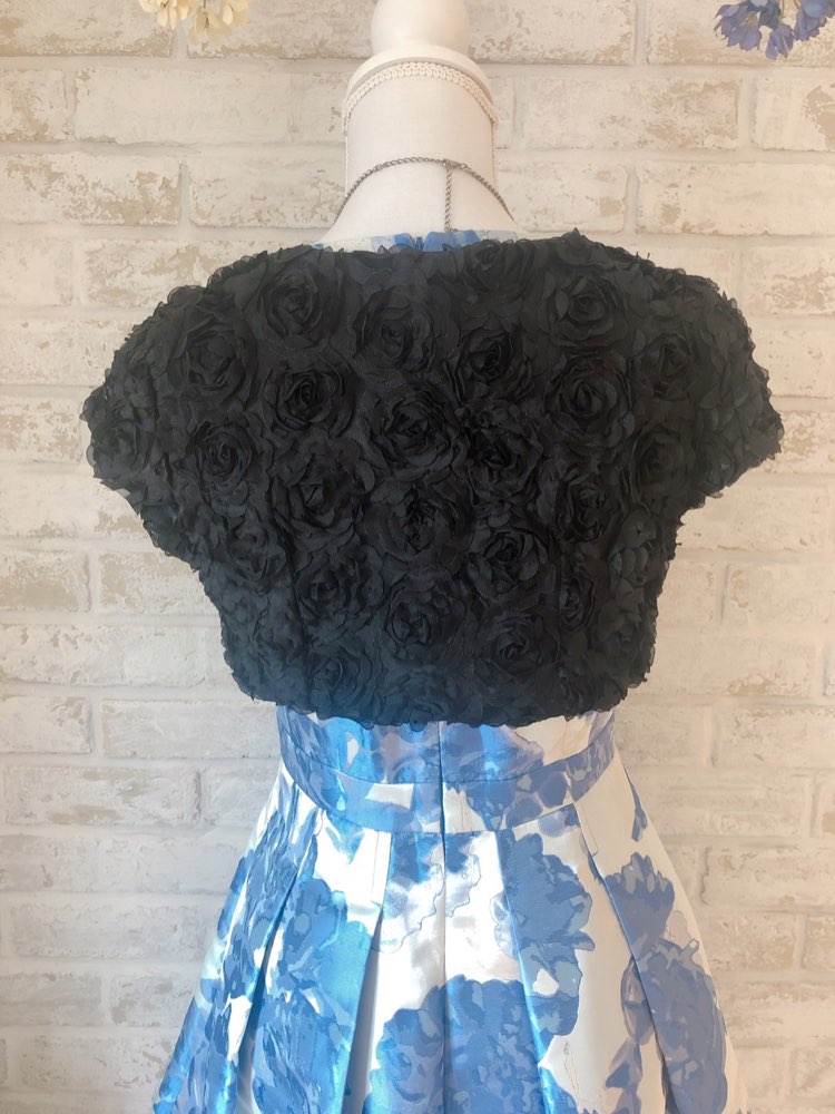 NFBO-39のファーボレロとデザインはとても似ています!ファーではないので、季節感関係なしで着ていただけます!丈間は短めのブラックボレロです。バラのようなデザインのフリルデザインがとても可愛くて華やかに着ていただけます!