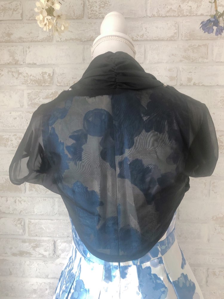 パールのデザインの丈間は短めのブラックボレロです!パールがポイントなので、ドレスや小物をパール系統で合わせても統一感が出て、とても可愛いです!ブラックですがパールのデザインが華やかに魅せてくれます!