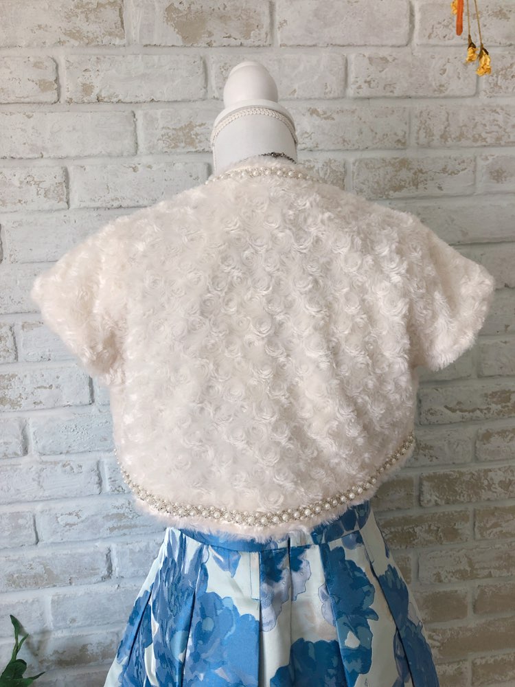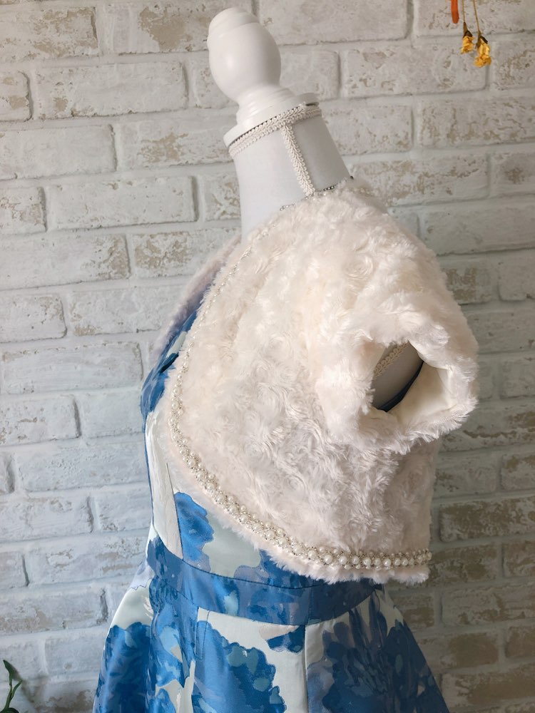 パールが付いたクリームカラーのファーボレロです!ファーなので、秋冬にオススメで、色味も真っ白ではなく、クリーム系の色味なので、白飛びしすぎず、どのドレスにもとても合わせやすく、大変人気な商品となっております!