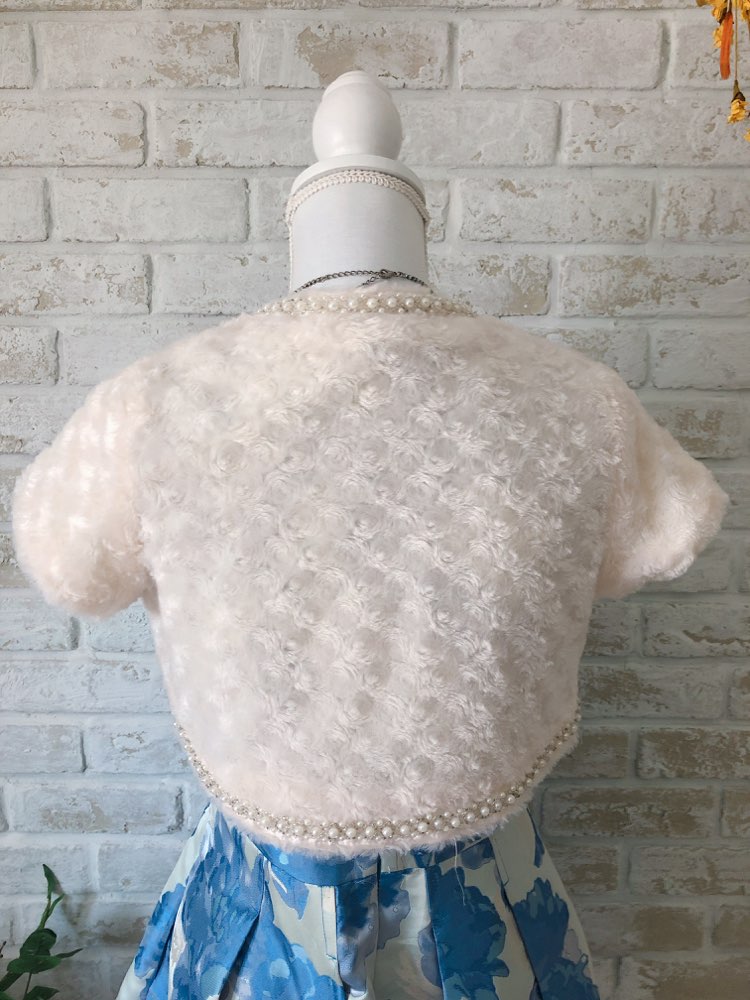 NFBO-51のファーボレロと色違いのピンクベージュカラーバージョンです!ファーなので秋冬にオススメで、ピンクすぎず、ベージュも入っているので合わせやすく、ピンクという女性らしさの色味でどのドレスにも合いますが、赤系統の色味で合わせても統一感が出て可愛いです!