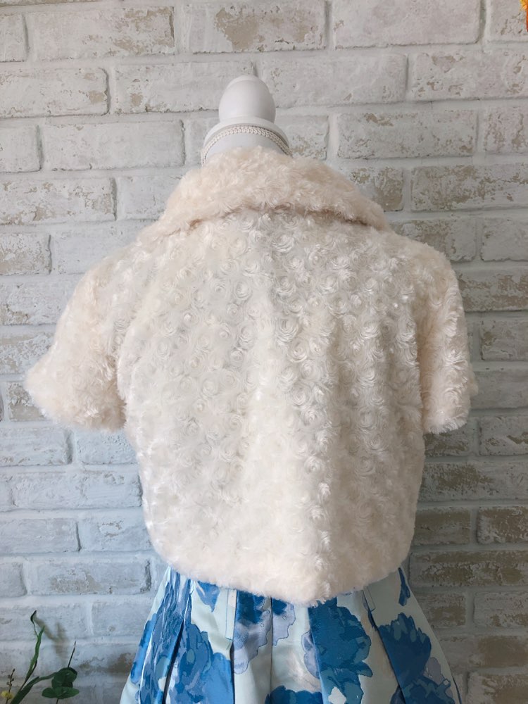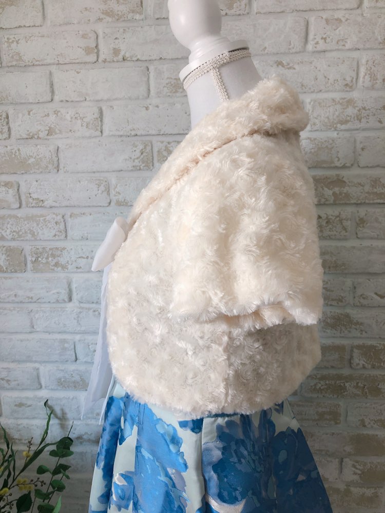 ファーボレロの中でもあまり見ない形で、セーラー服のような襟付きで、かぶることは無いような形でオススメな1点です!胸元でリボンを作る感じになっていて、とても可愛いくポイントなのと、かなりキュートな印象になるのでキュートに決めたい方にオススメです!ファーなので秋冬が1番のオススメとなってます!
