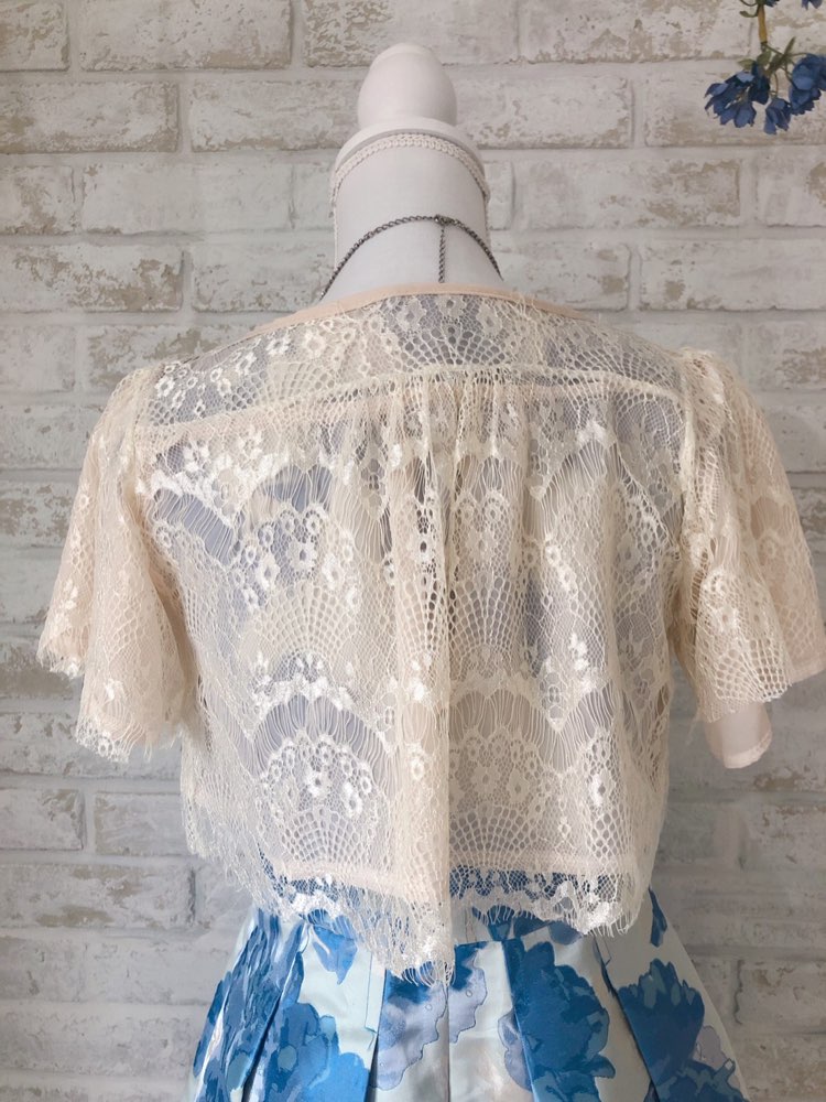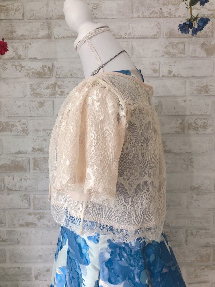 全体がレースデザインで、とても女性らしいデザインとなっております。シンプルめなドレスと合わせるのが1番キレイに見えるかと思います!色味はベージュとピンクベージュの2種類あって、いろんな可愛い着こなし方ができる1点ものです!
