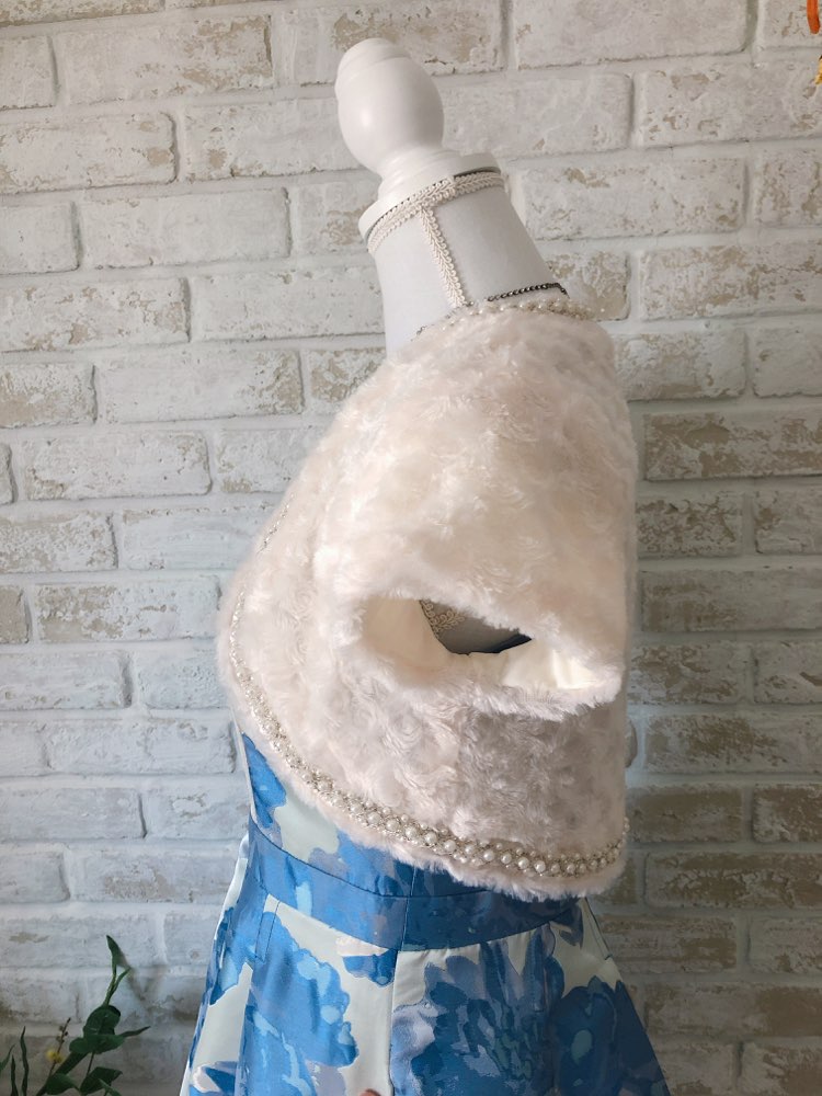 NFBO-51のファーボレロと色違いのピンクベージュカラーバージョンです!ファーなので秋冬にオススメで、ピンクすぎず、ベージュも入っているので合わせやすく、ピンクという女性らしさの色味でどのドレスにも合いますが、赤系統の色味で合わせても統一感が出て可愛いです!